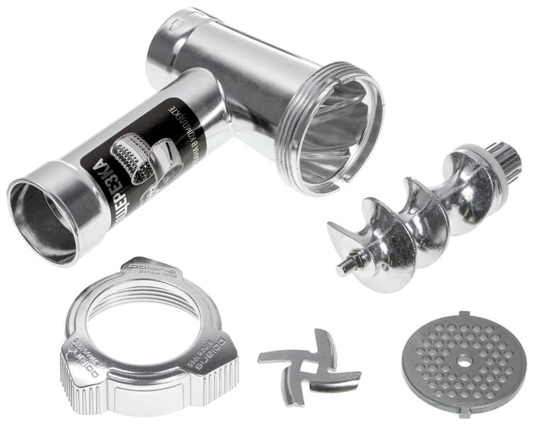 На горловине мясорубки устойчиво закрепляется металлический лоток для мяса. Также в комплект входят пластиковый толкатель, комплект для изготовления кеббе и длинная коническая трубка для набивки колбасных изделий — тоже из пластика.