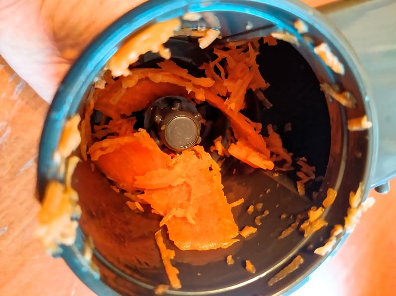 Для мелкой терки почистили 2 средние моркови. На второй скорости морковь измельчилась за 8 секунд. При этом ничего не разлеталось, столешница вокруг миски осталась идеально чистой.