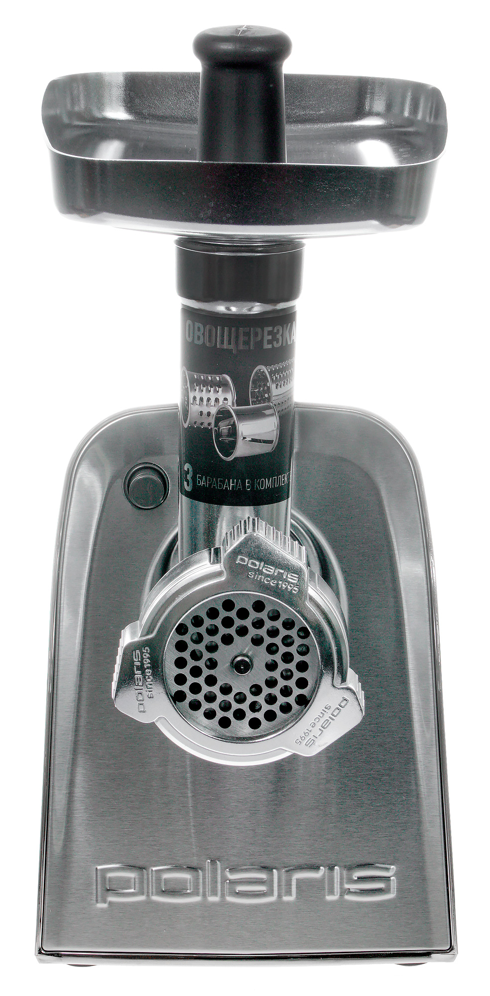 Немаленький размер коробки уже морально подготовил нас к габаритам мясорубки, но все-таки первая мысль при ее виде на столе: большая. Впрочем, такой размер — плата за отсек для насадок. Корпус PMG 2292AL Silent пластиковый с металлической вставкой спереди, но пластик удачно маскируется под металл.