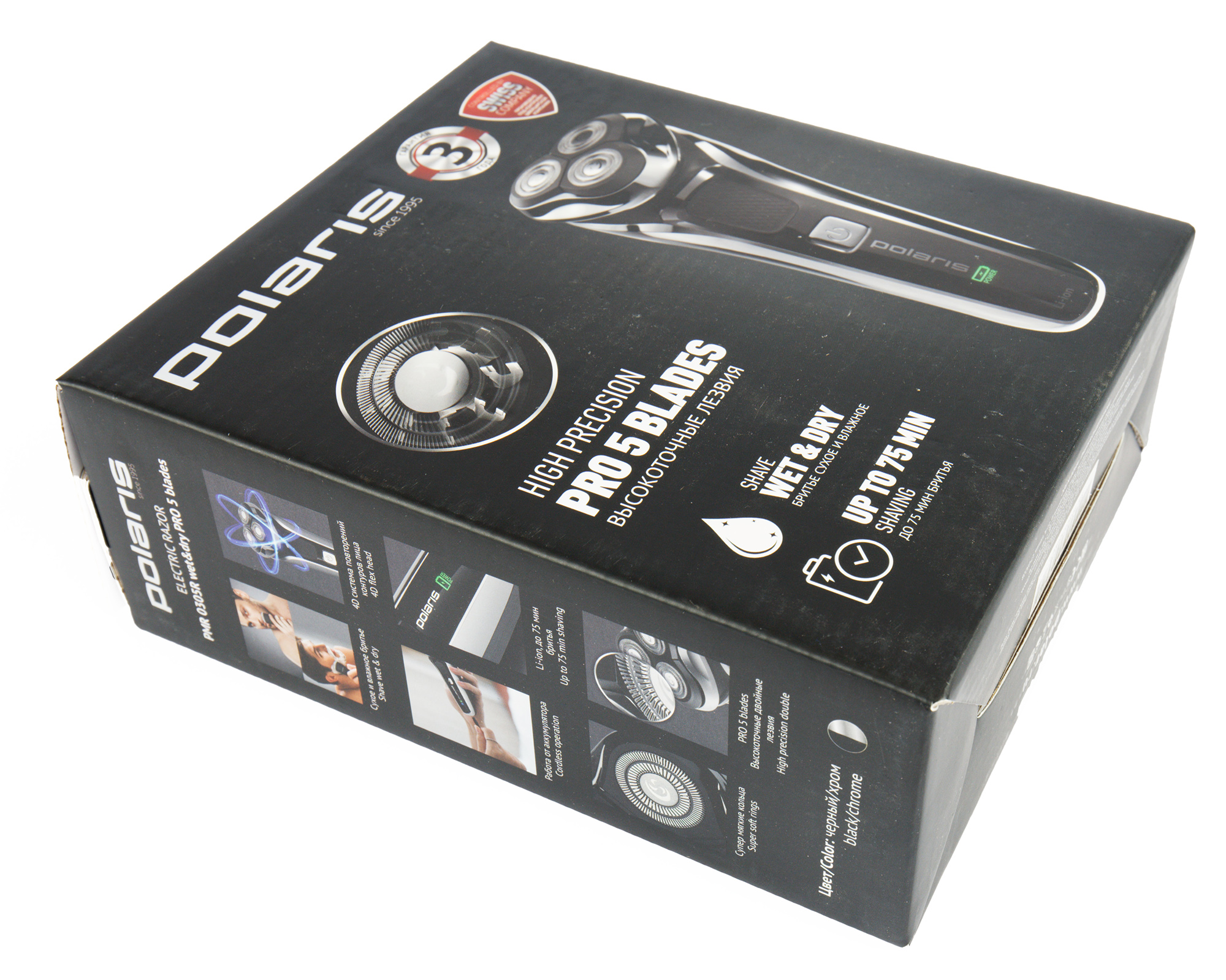 Бритва поставляется в небольшой картонной коробке, оформленной в фирменном стиле Polaris: черный фон, фотография устройства, описание его основных особенностей и характеристик.