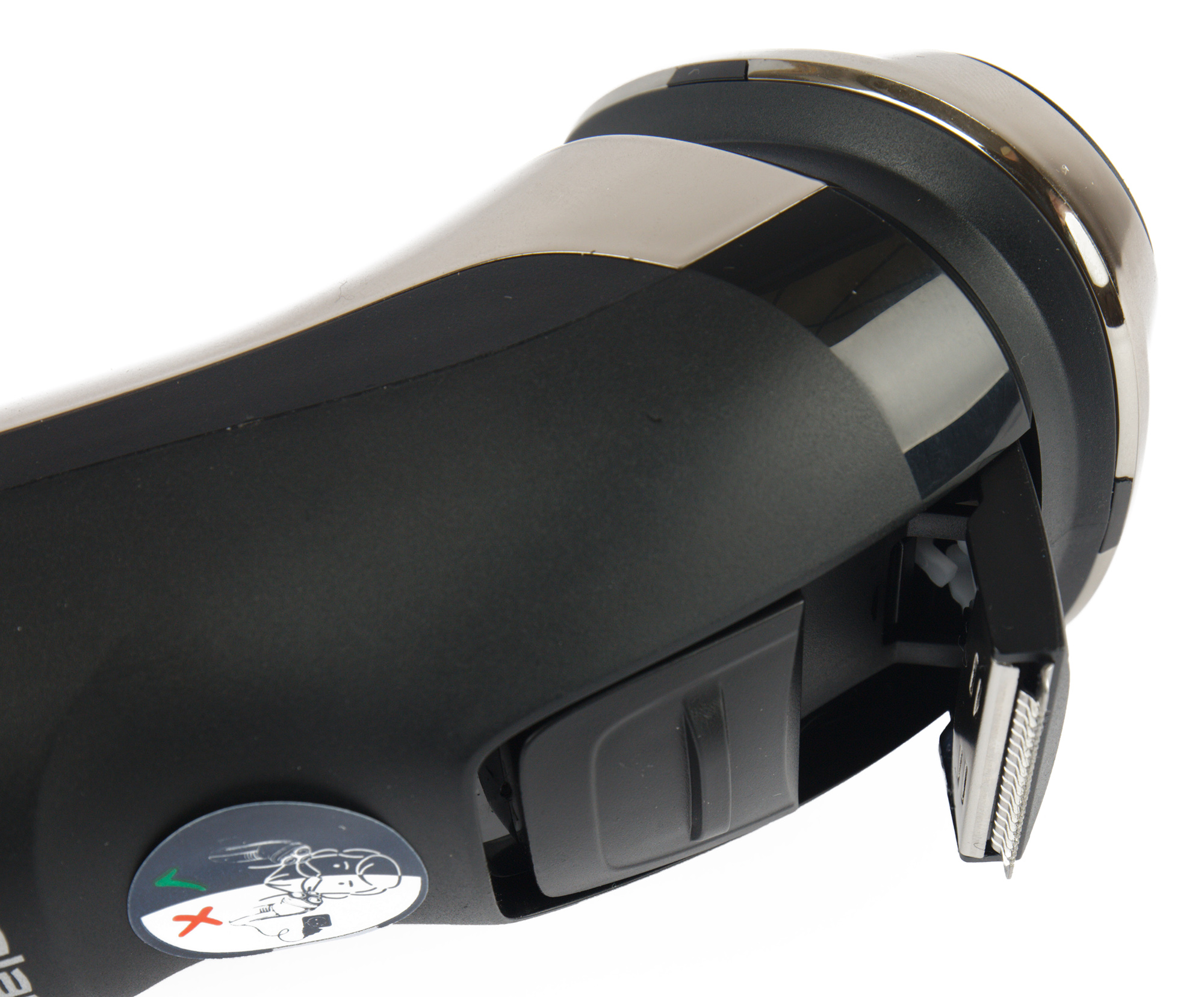 С тыльной стороны палец попадает в специальное углубление (там мы видим наклейку, предупреждающую, что бритвой нельзя пользоваться при подключенном адаптере питания).