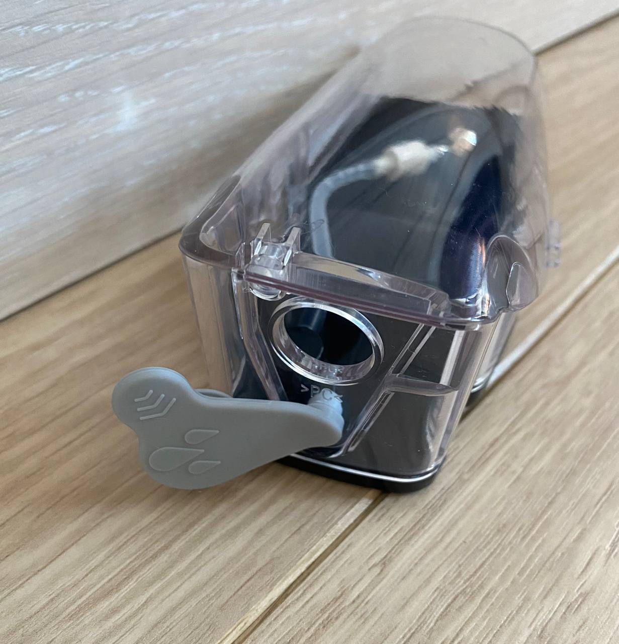 На фото показан резервуар для воды в извлеченном состоянии. Справа, на его торце, видна уплотнительная крышка из силикона серого цвета.