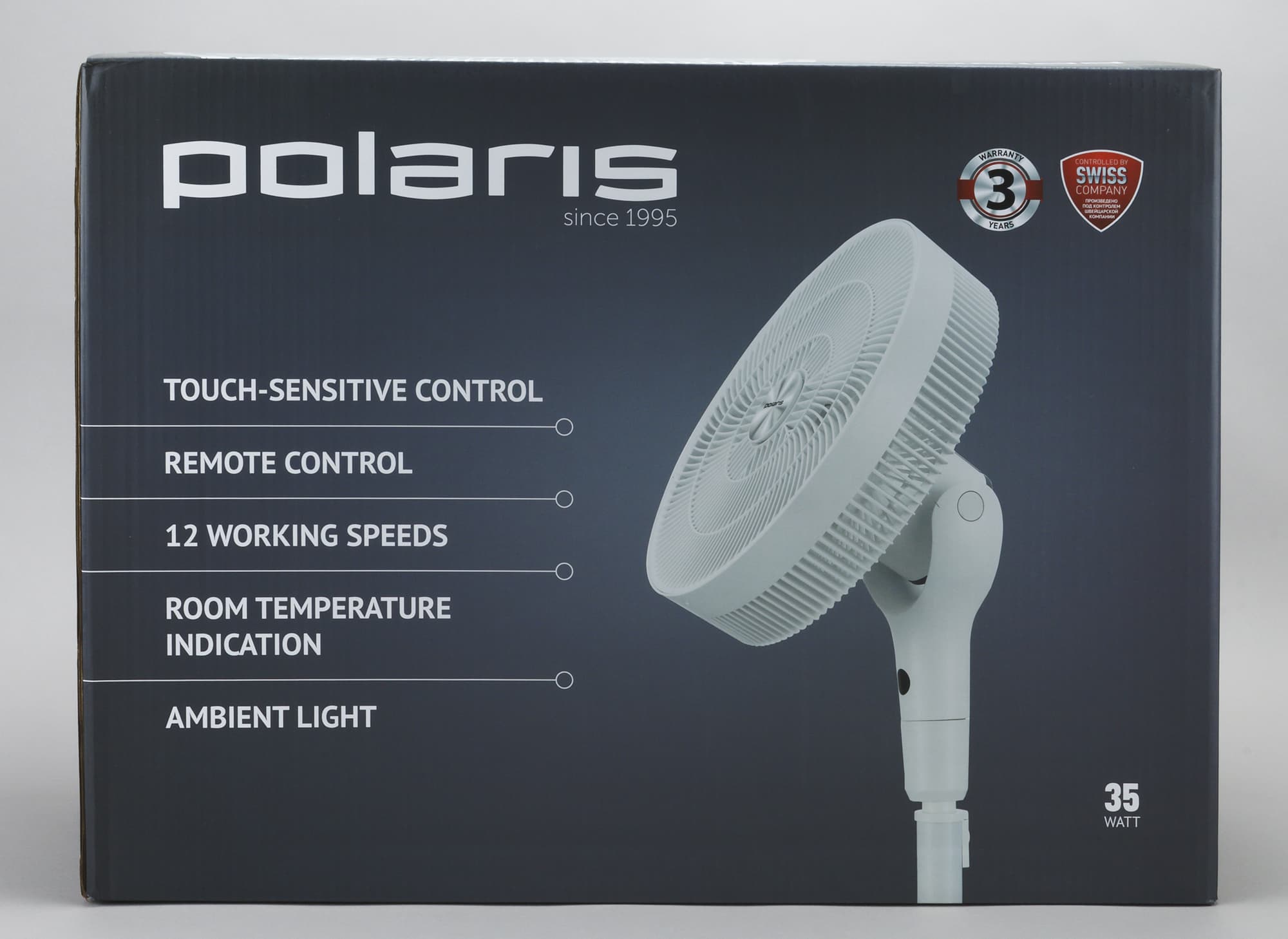 Вентилятор поставляется в плоской коробке картонной коробке достойного качества. Дизайн выполнен в фирменном стиле Polaris — синий фон, на коробке размещена фотография прибора, а также приведены основные особенности модели.