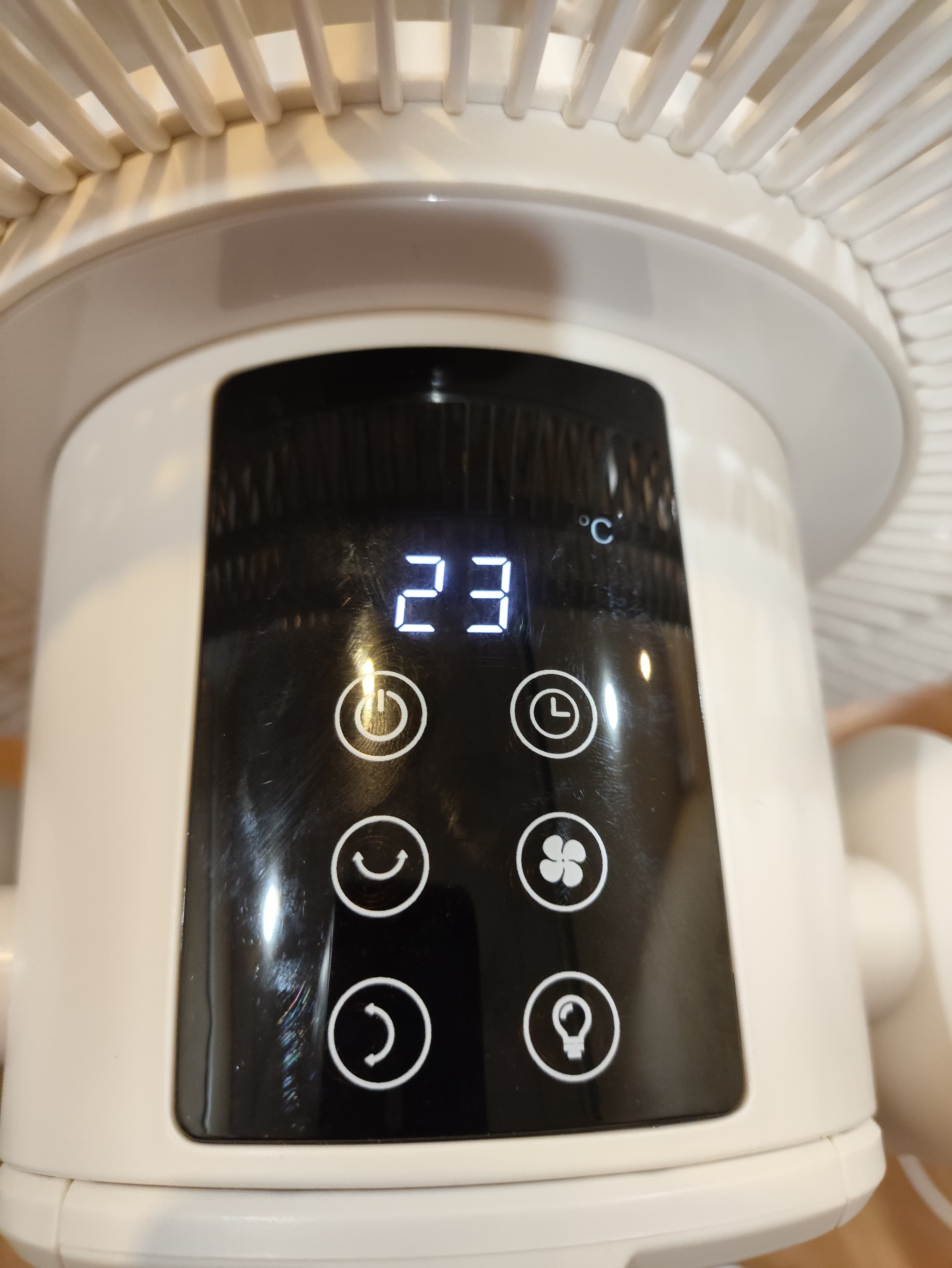 Наш вентилятор управляется с помощью шести сенсорных кнопок, расположенных на моторном блоке. Рядом с ними размещены светодиодные индикаторы, обозначающие выбранный режим работы. При включении прибора на экране выводится текущая температура в помещении.