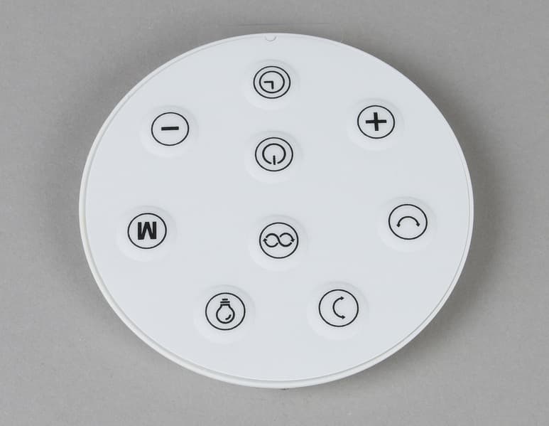Тут производитель также решил не идти простым путем (т. е. не положил в комплект один из стандартных пультов), а проявил оригинальность. Пультик у нас оказался круглый, батарейка CR2032 уже установлена. И самое неожиданное — он оказался магнитным. То есть пульт можно «прилепить» к любой магнитящейся поверхности — к настольной лампе, к холодильнику, к корпусу компьютера или даже к штанге самого вентилятора (чтобы он не потерялся).