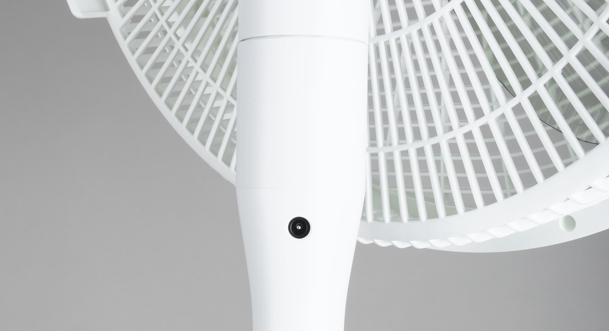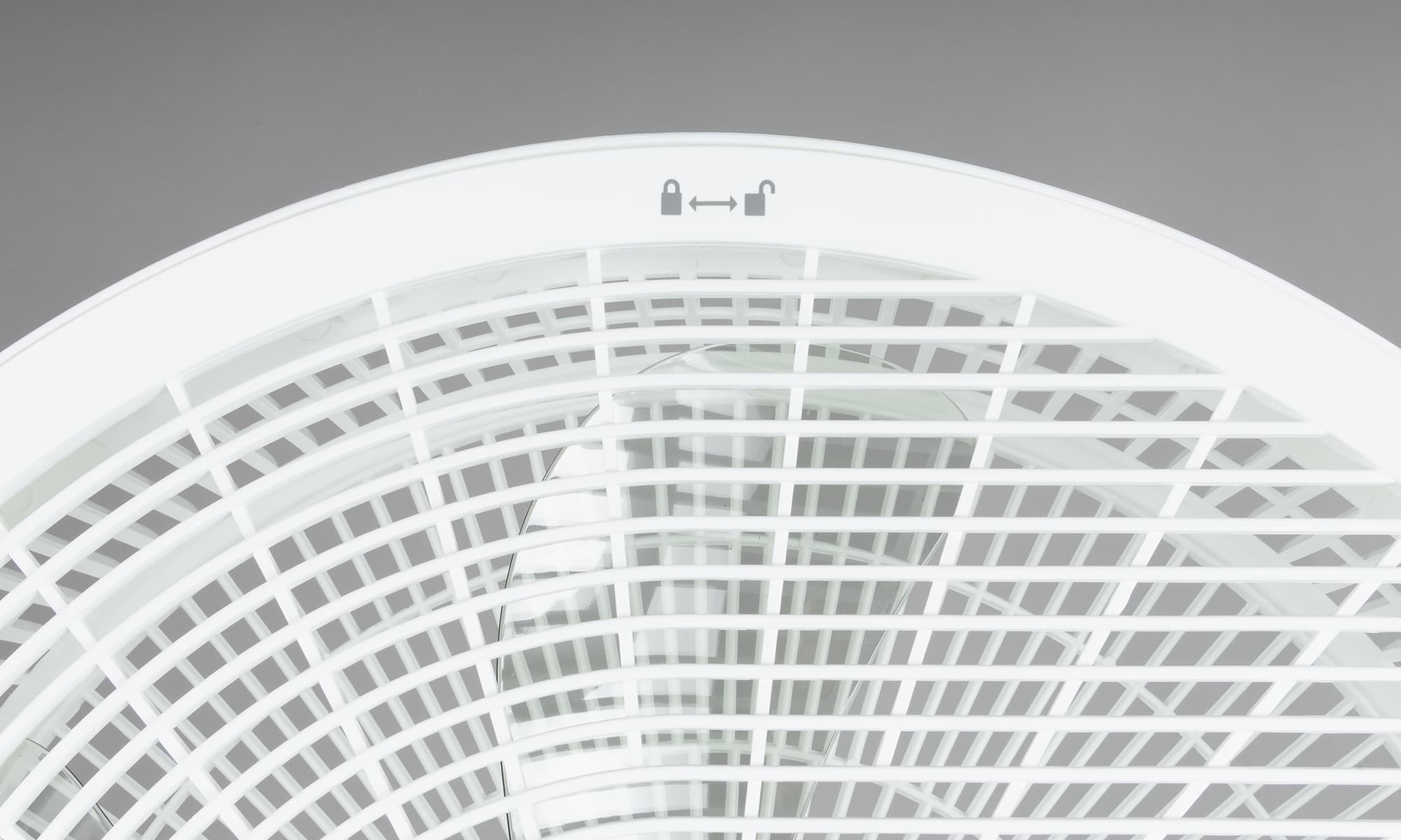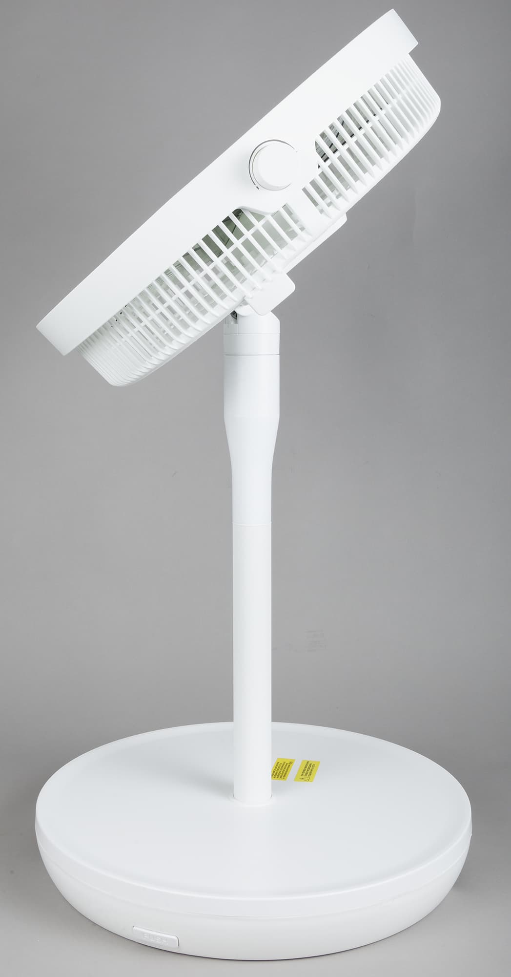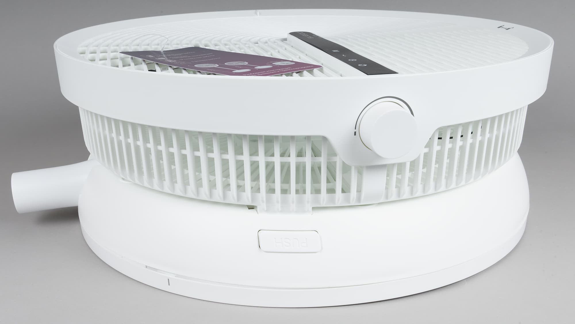 Защелки скрываются внутри нижней части под двумя длинными белыми кнопками «Push». Одновременное нажатие этих кнопок позволяет без труда отсоединить крыльчатку с решеткой и моторным блоком от основания.