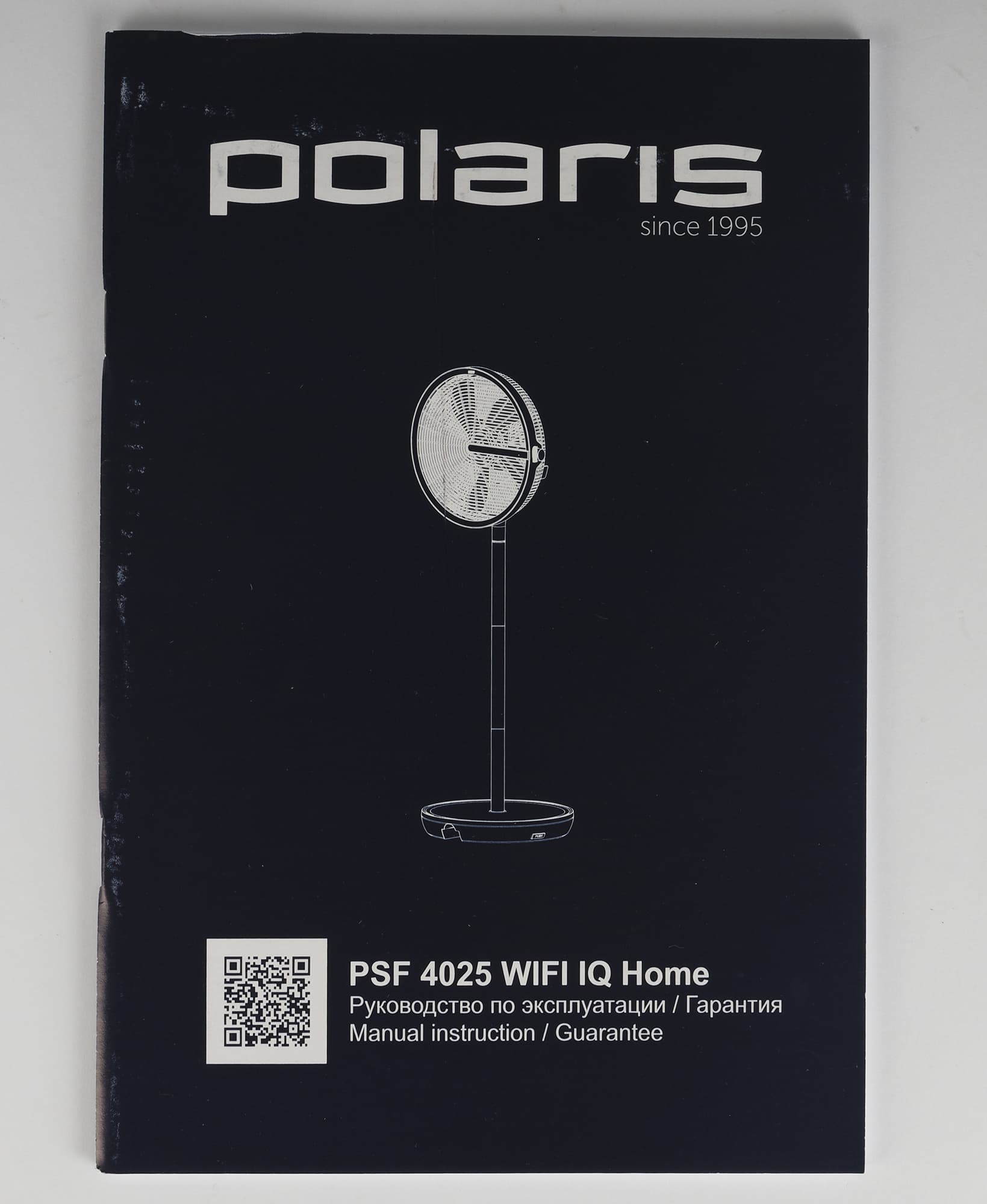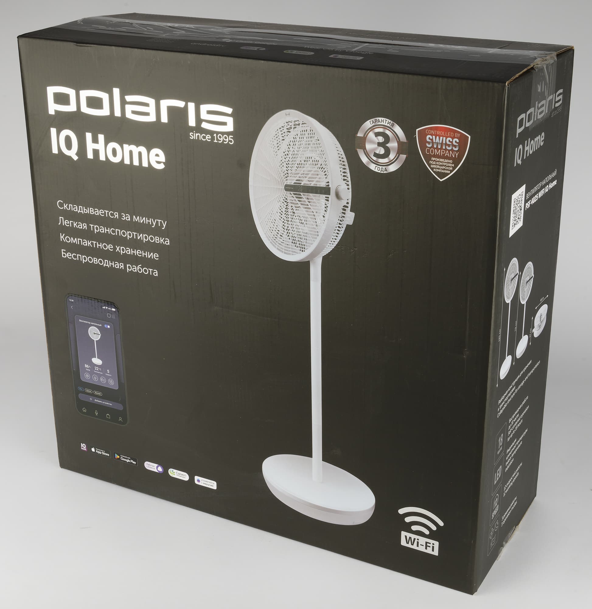 Вентилятор поставляется в довольно большой плоской коробке из черного глянцевого картона с цветной печатью. На лицевой стороне упаковки размещены логотипы производителя, наименование модели, фотография прибора и смартфона с приложением Polaris IQ Home, через которое реализуется управление вентилятором.
