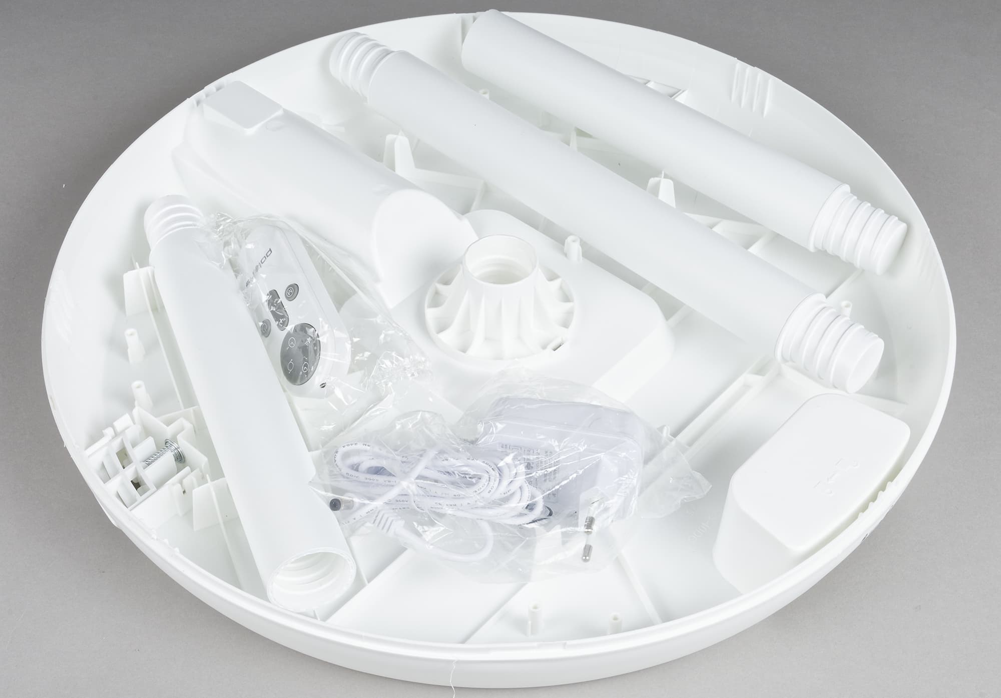 А находятся они вместе с пультом ДУ и адаптером в разборном основании прибора: