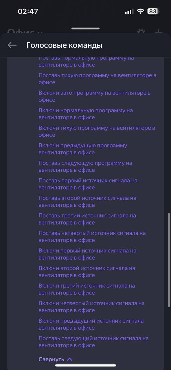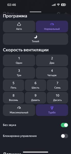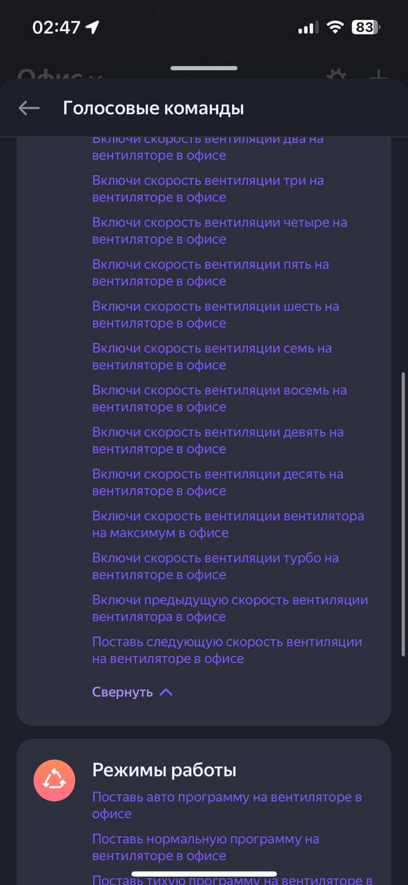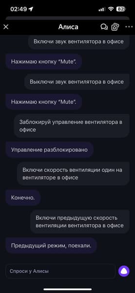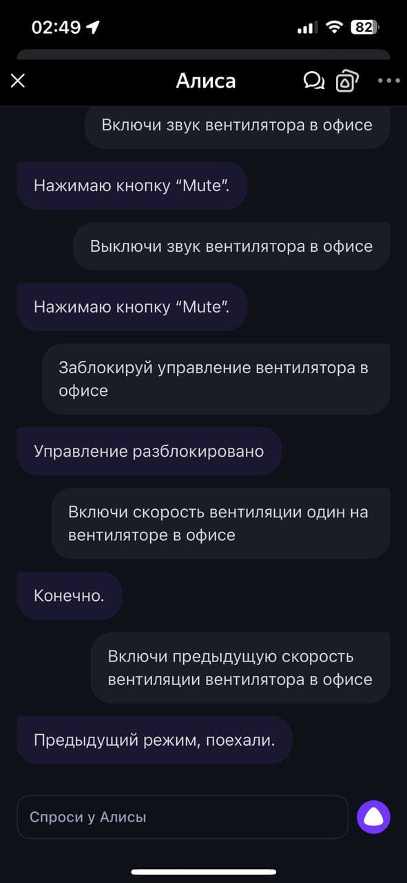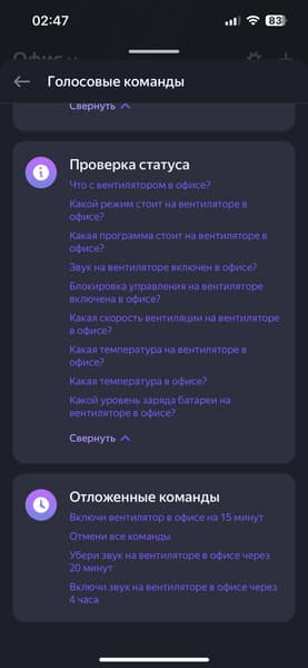 Алиса тоже неплохо руководит вентилятором как из приложения, так и через умную колонку. Она знает достаточно много команд — от статуса прибора, включения/выключения и установки таймера, ночника, переключения режимов, скоростей и до блокировки управления и отключения звуковых сигналов.