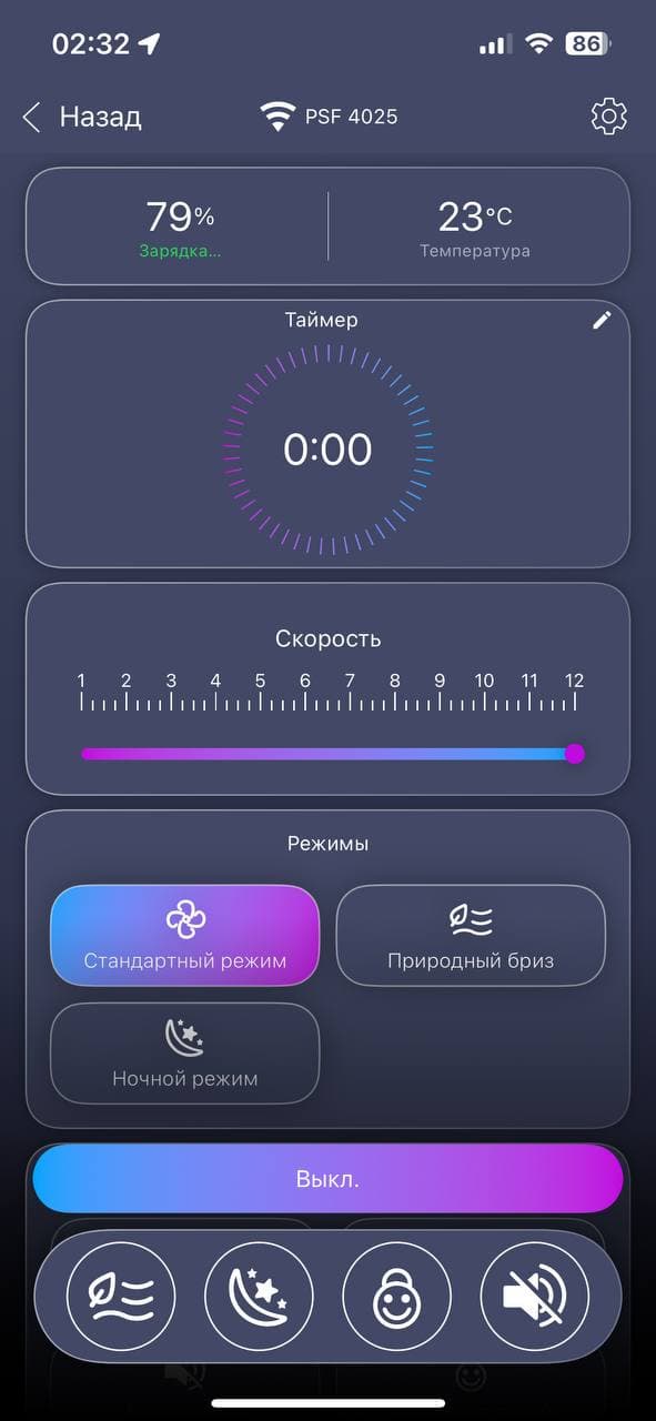 Все заявленные 12 скоростей исправно работают, три сценария работы также показали себя удобными в повседневном использовании — «Ночной режим» постепенно понижает скорость до минимального уровня, а «Естественный обдув» имитирует ветер, циклично замедляясь и ускоряясь.