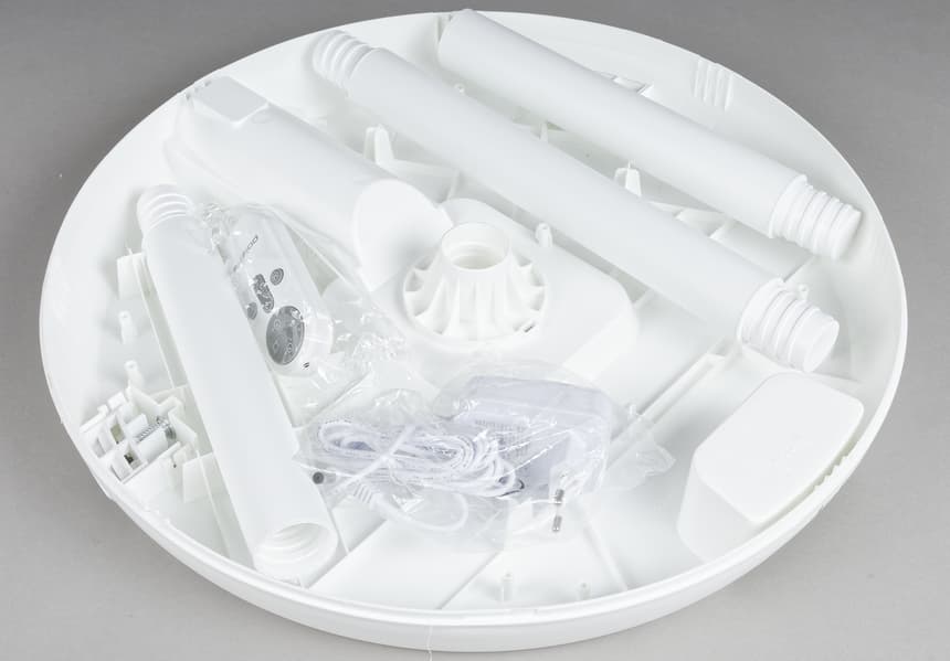 Внутри коробки мы обнаружили вентилятор в разобранном виде, съемный шнур электропитания, пульт ДУ и руководство пользователя с гарантийным талоном.