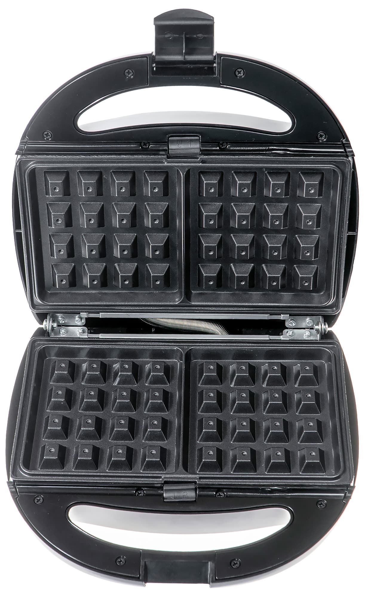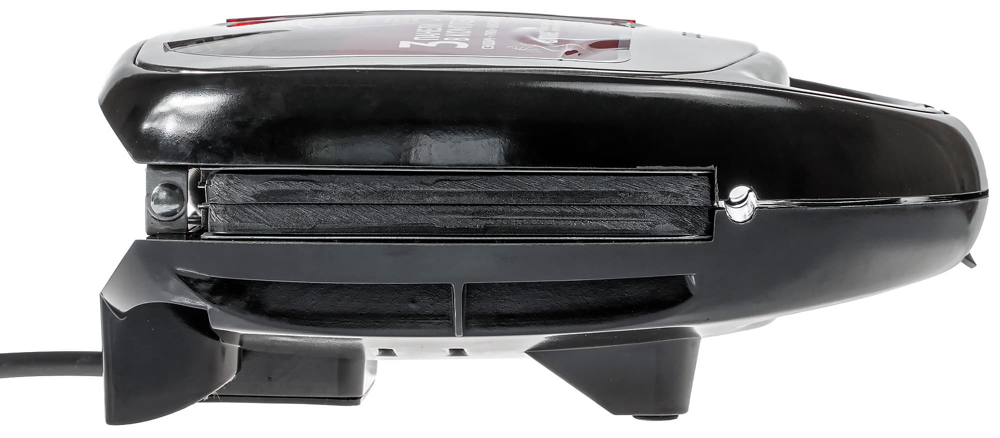 Визуально наша вафельница производит впечатление недорогого устройства. Основной материал корпуса — черный глянцевый пластик (местами заметны дефекты литья). Верхняя крышка металлическая. Давайте рассмотрим прибор повнимательнее.