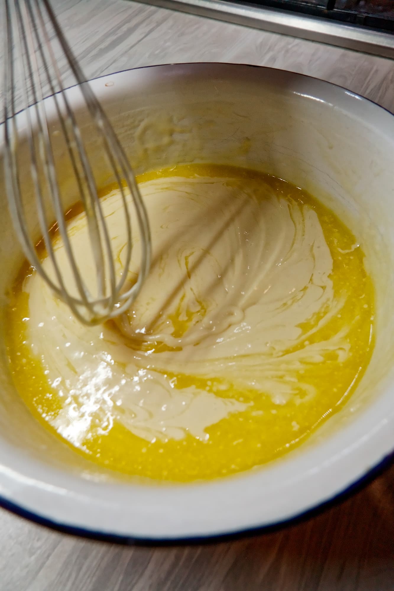 Все, что от нас потребовалось — залить смесь теплой водой, добавить растопленное сливочное масло и перемешать его до однородной консистенции.