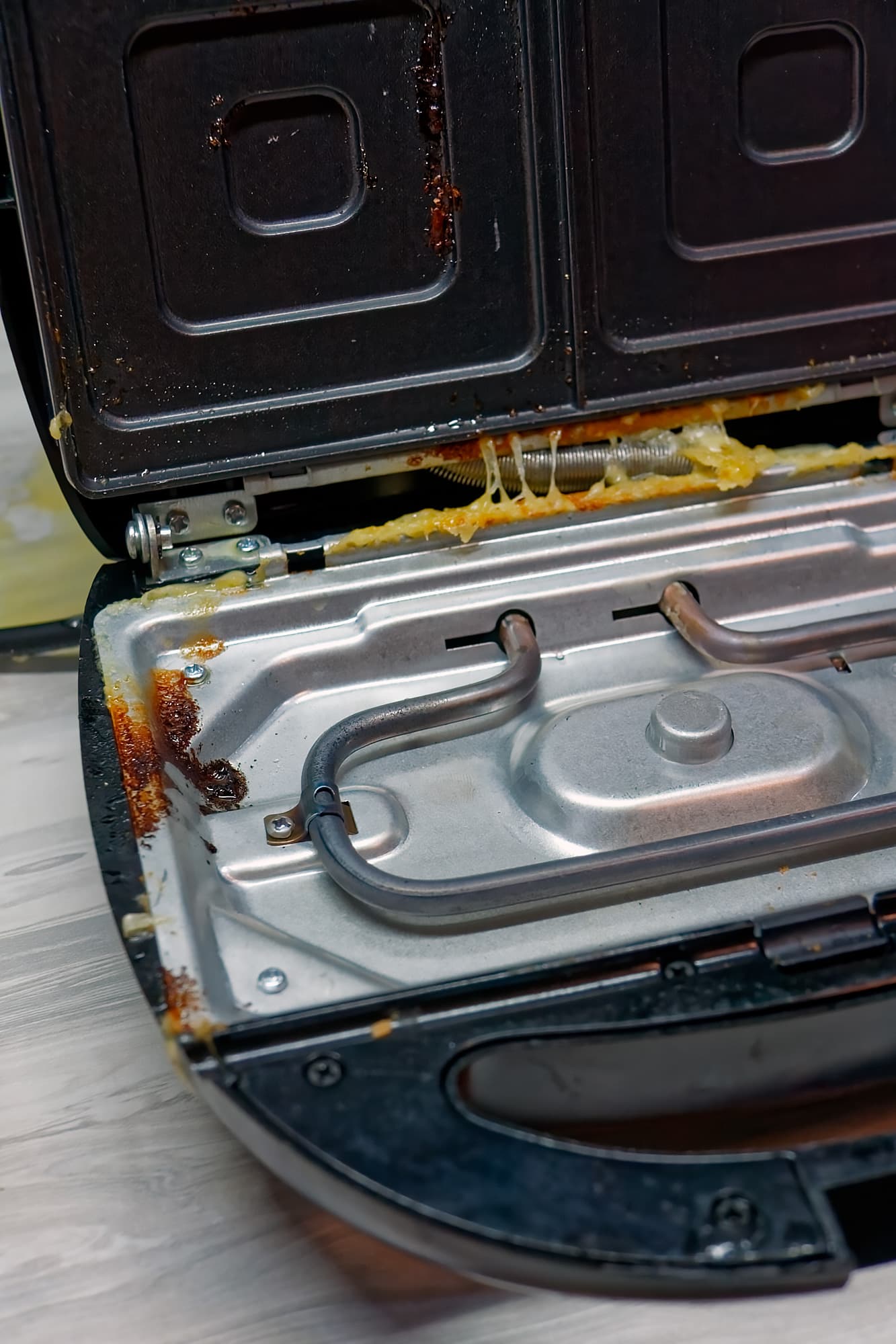 Неправильно собрал горячий бутерброд с сыром? Сыр также вытек на столешницу через стык, а заодно протек под панели и начал подгорать в непосредственной близости от нагревательного элемента (вообще, надо сказать, сыр из нашей сэндвичницы вытекать любит — даже если мы взяли его совсем немного и постарались не класть его по краю бутерброда).