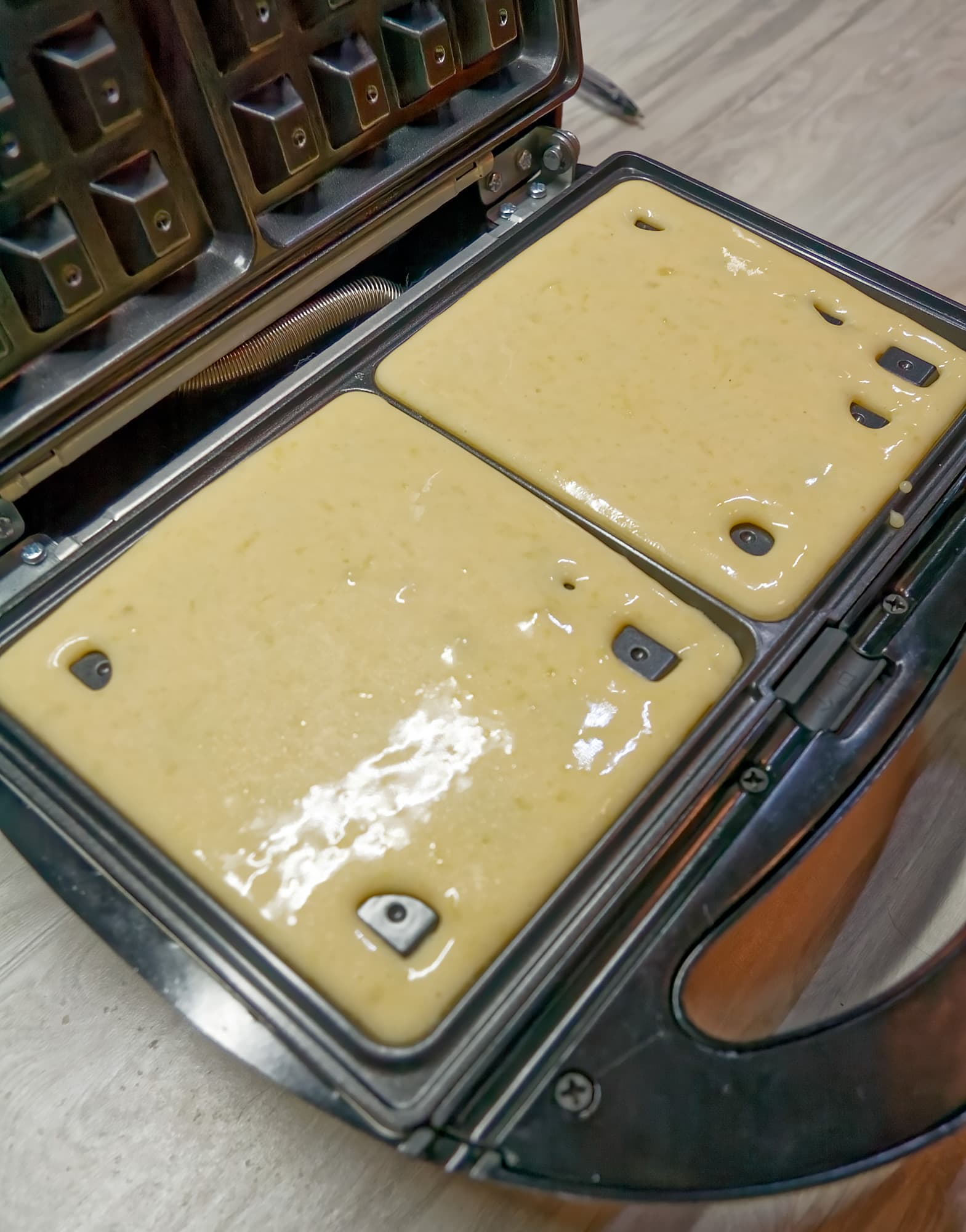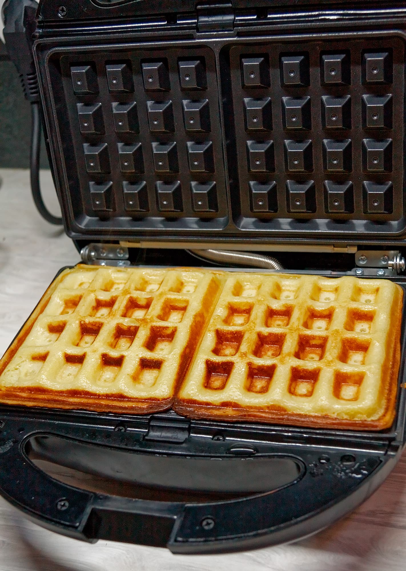Несмотря на то, что на коробке со смесью было указано, что время приготовление вафель составляет 5-6 минут, в нашем случае на полноценную прожарку потребовалось 10 минут.