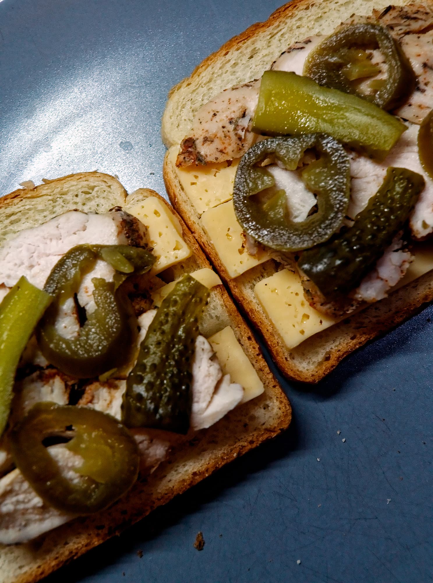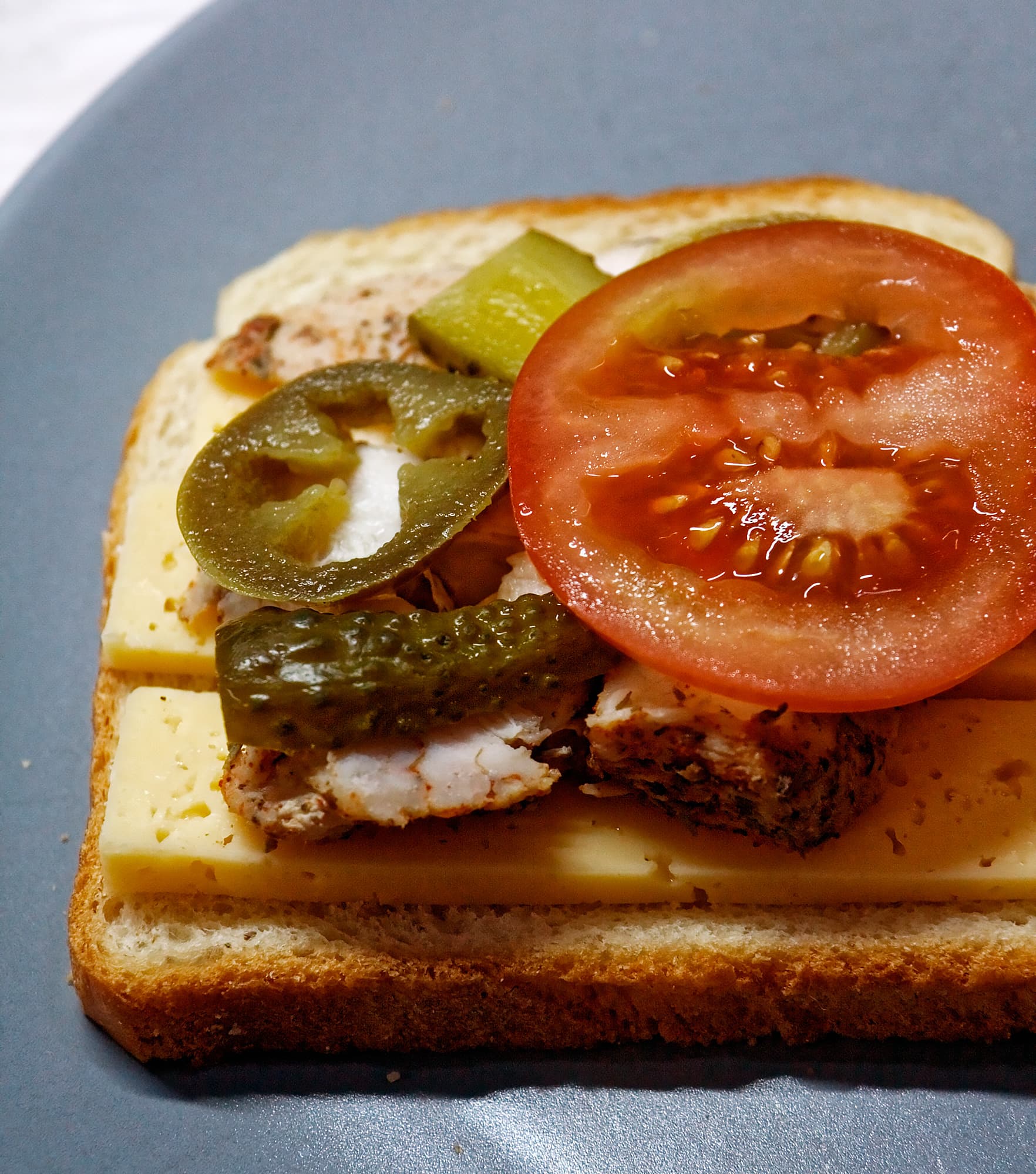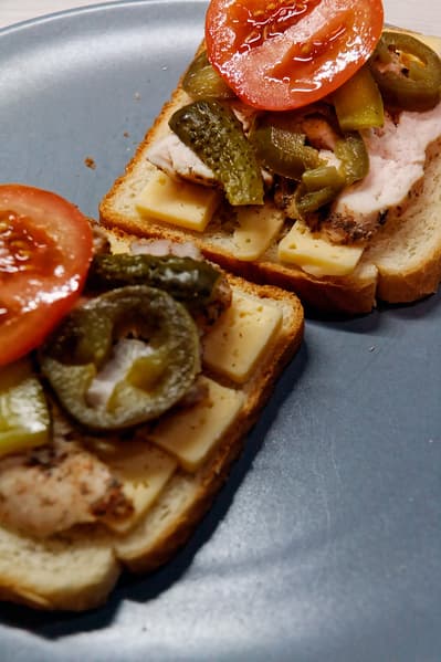 В нашем случае в холодильнике нашлись готовые куриные грудки, помидор, сыр, маринованные огурчики, перец халапеньо и горчица.