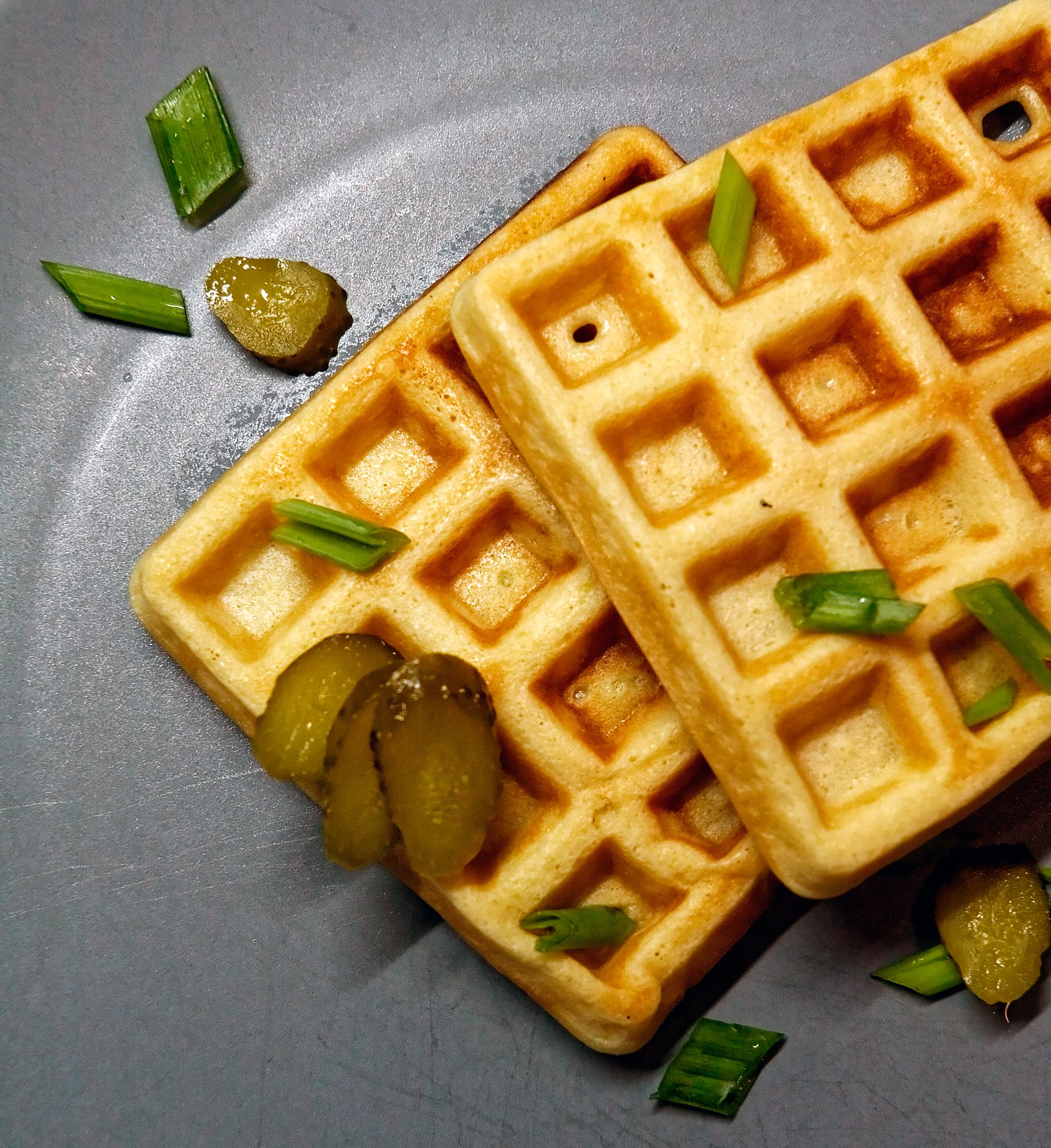 Добавили к вафлям немного зеленого лука и маринованных огурчиков.