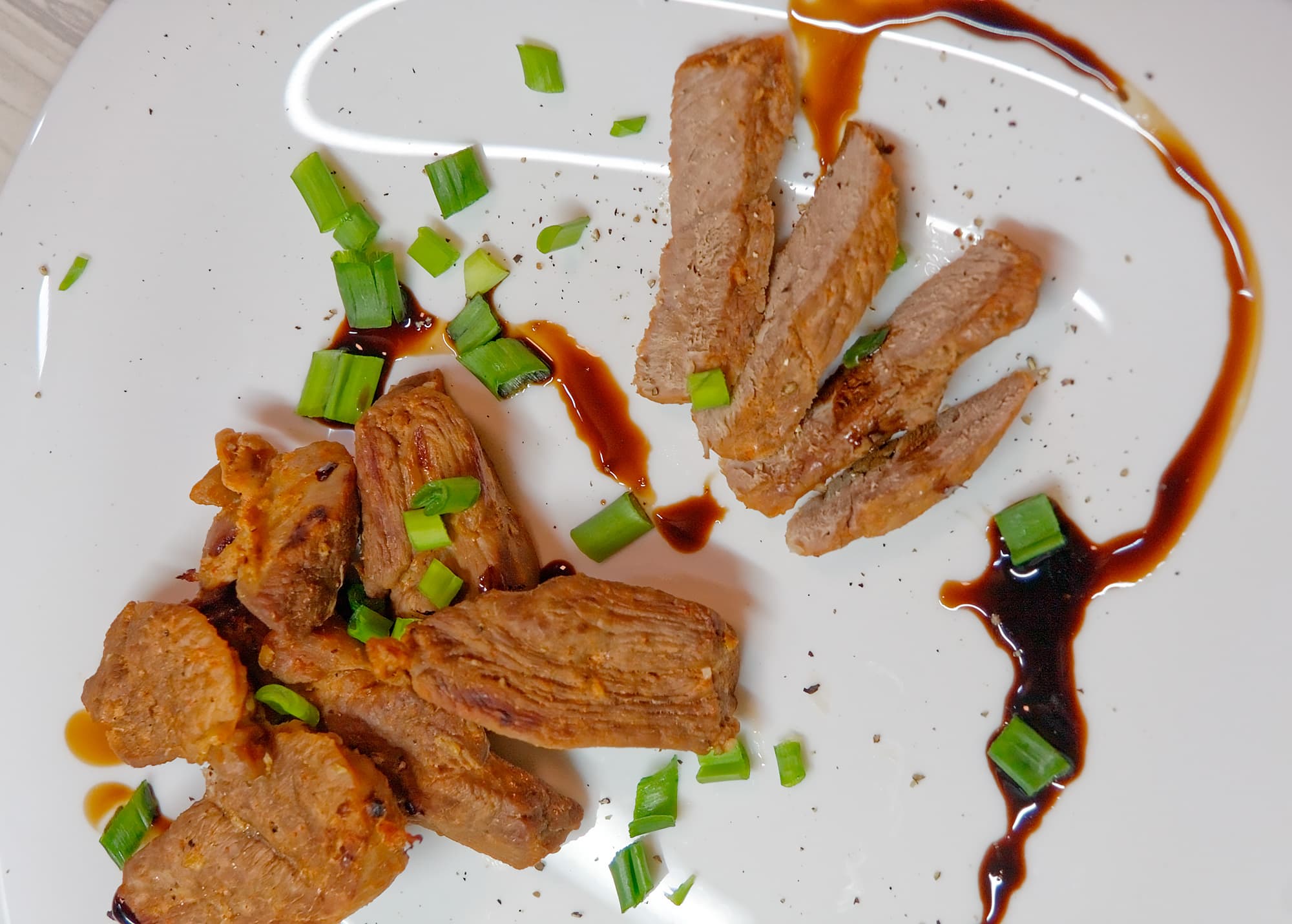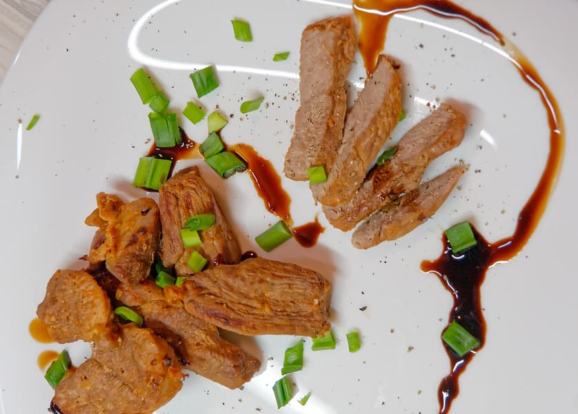 Как видно на фото, тут мы несколько перестарались. Утка явно пережарилась, ей хватило бы и пяти минут — это наша ошибка. А вот характерной поджаристой корочки мы так и не увидели. Она едва проявилась на паре кусочков.