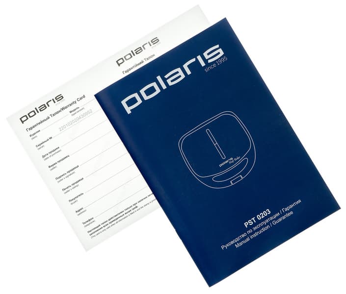 Прибор поставляется в картонной коробке, оформленной в фирменном стиле Polaris. Основной цвет — серый, для привлечения внимания используются красные элементы.