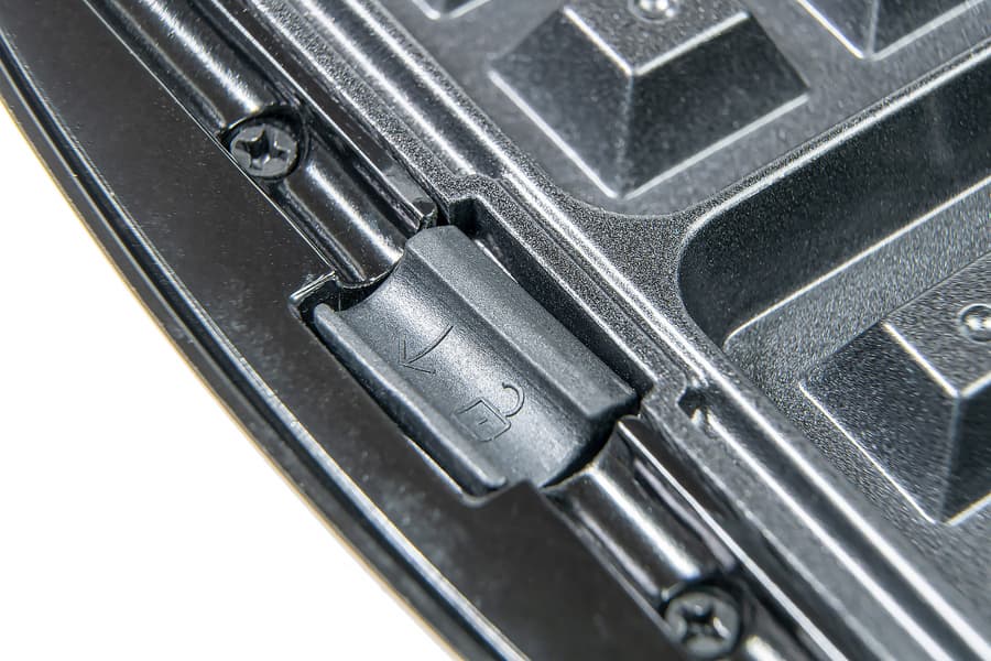 Внутри располагаются съемные панели. Они цепляются с помощью двух «ушек» с одной стороны и фиксируются подпружиненной кнопкой-защелкой в с другой. На кнопке нанесена стрелка, подсказывающая в какую сторону ее нужно сдвинуть.