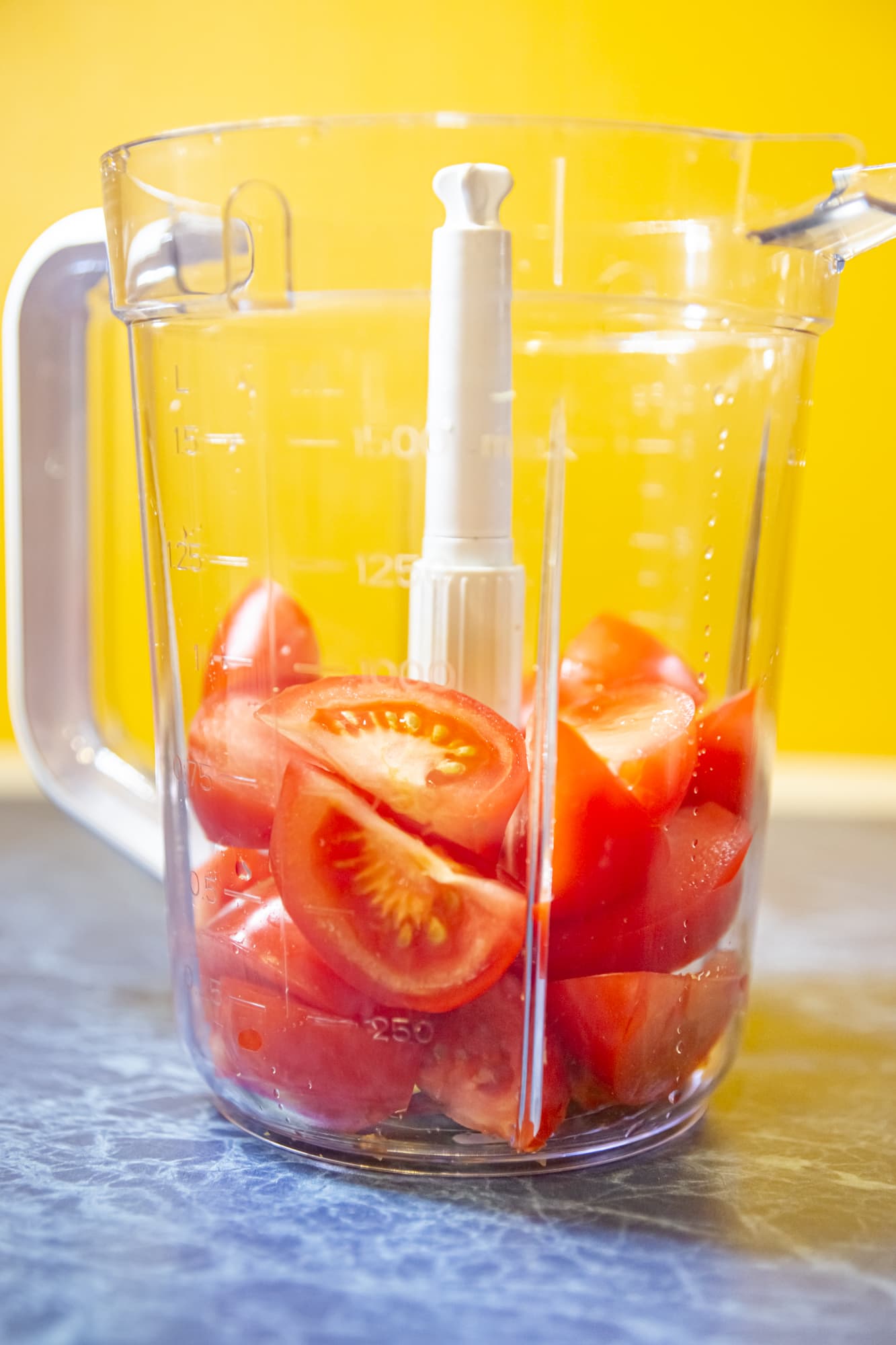 Тестирование блендера, как заведено, начинается с обязательного томатного теста. В чашу поместили нарезанные томаты, заполнив емкость до отметки в 750 мл.