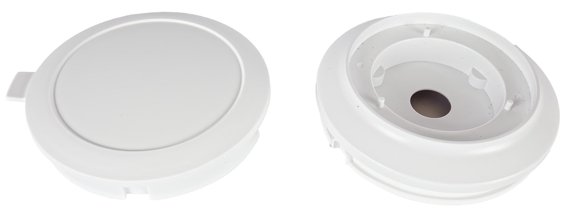 Перед началом работы на кувшин устанавливается фиксатор моторного блока. Он похож на крышку, но имеет углубления и выступы для установки моторного блока, а также круглое отверстие посередине. С внутренней стороны для лучшего сцепления с чашей по периметру фиксатор оснащен двумя резиновыми вставками. Ниже на фото: слева — крышка, справа — фиксатор моторного блока.