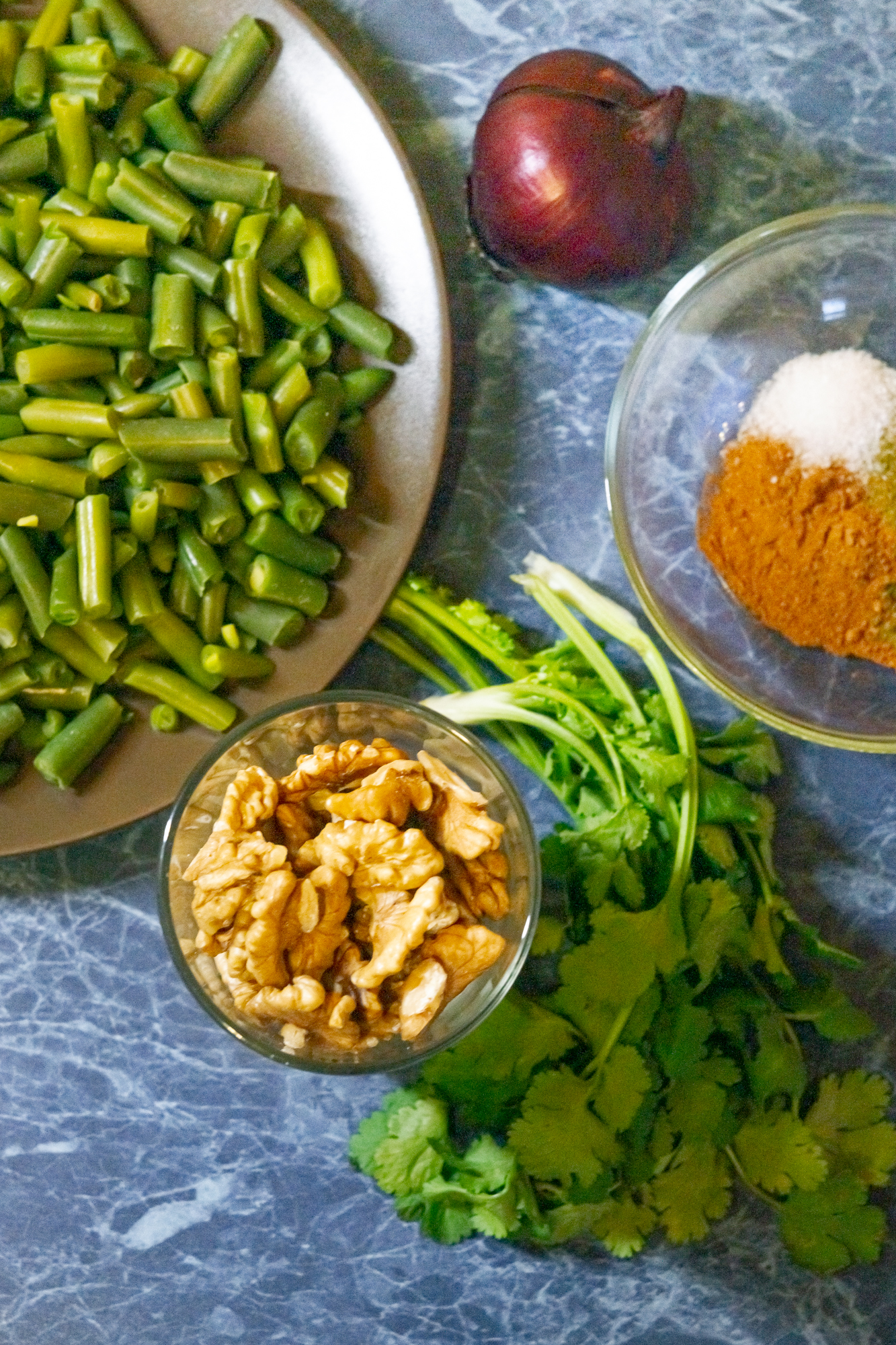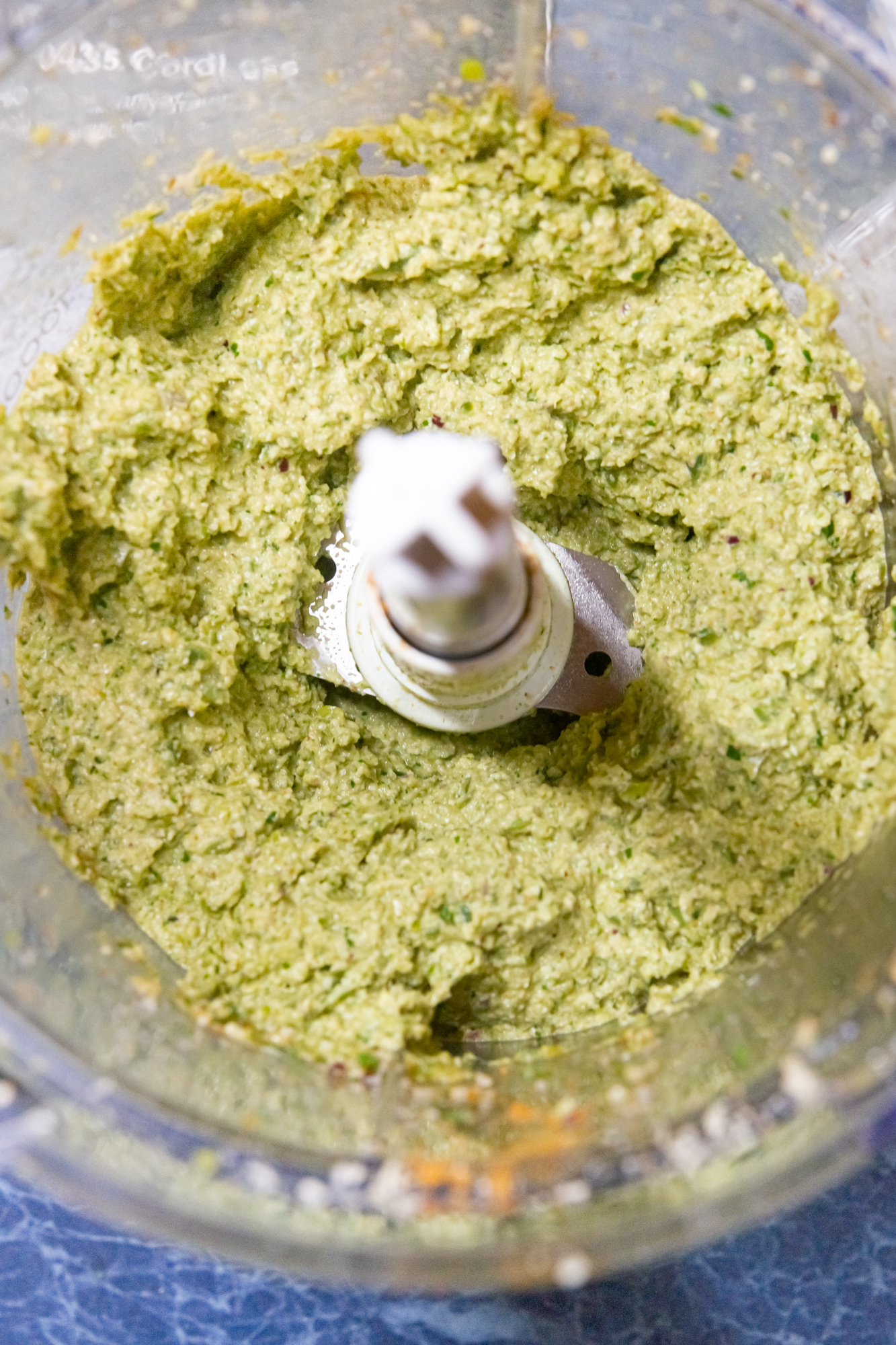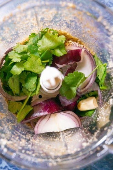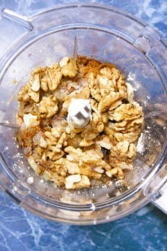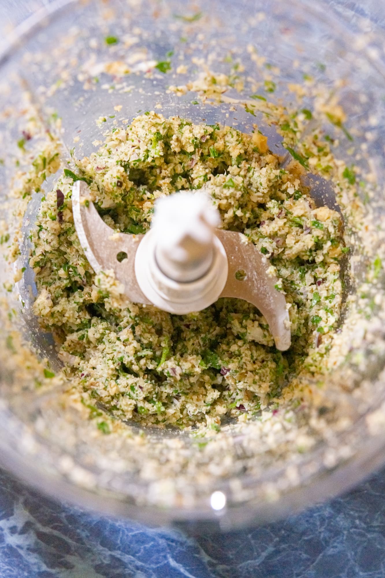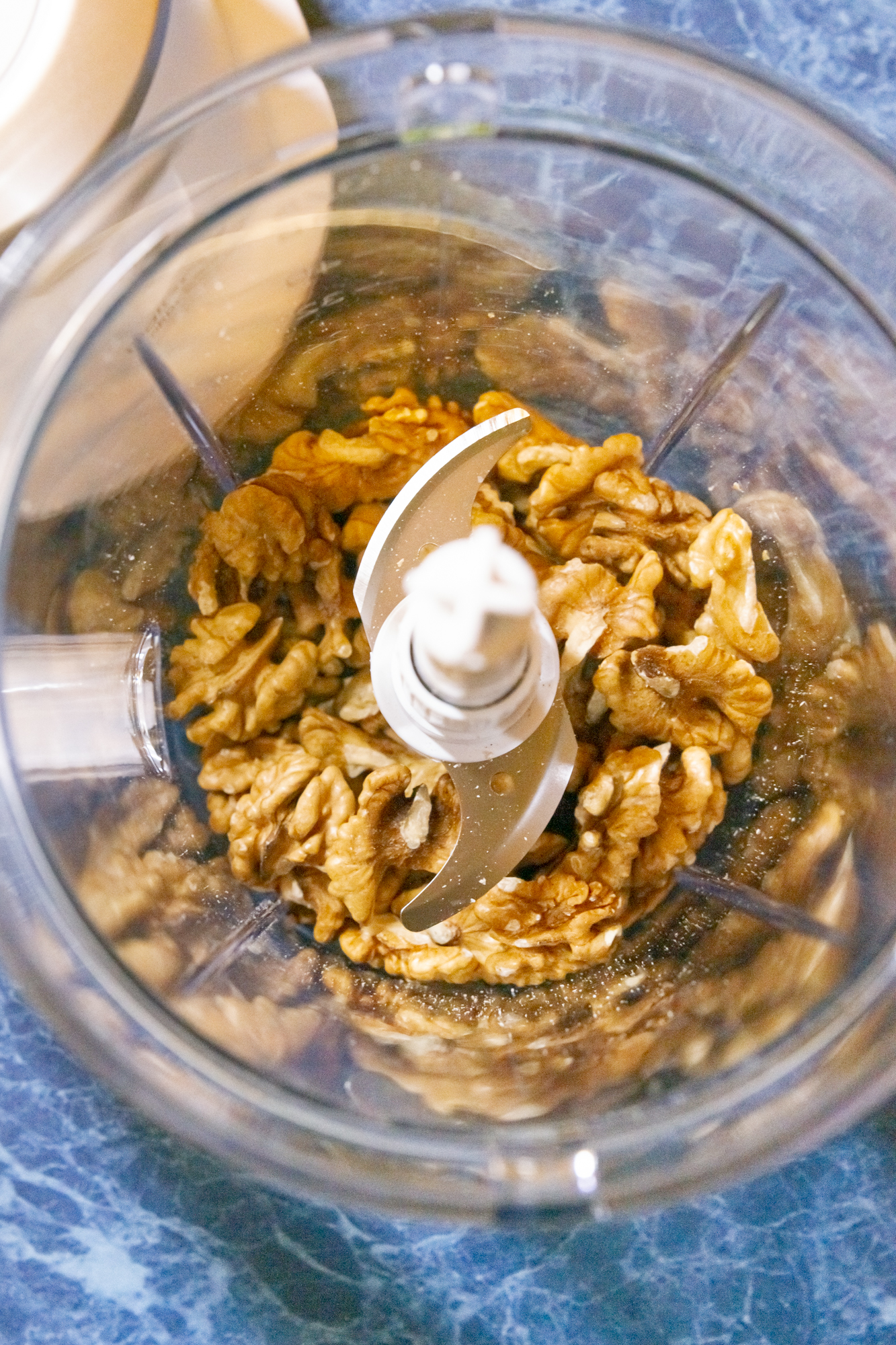 Затем к орехам добавили зелень, крупно нарезанный красный лук и пару зубчиков чеснока. Измельчали ингредиенты также на 1-й скорости в течение еще 15 секунд.