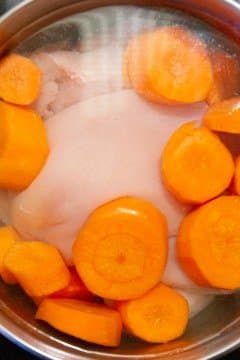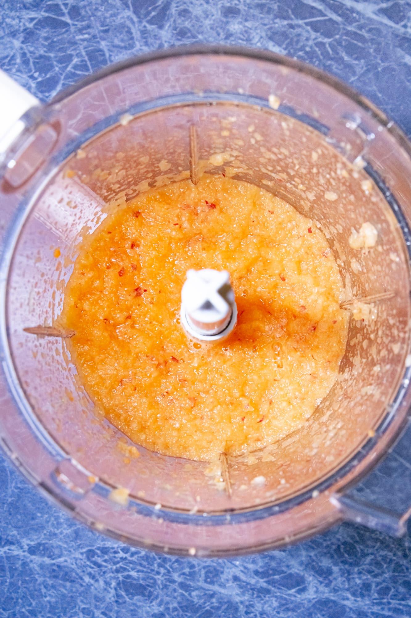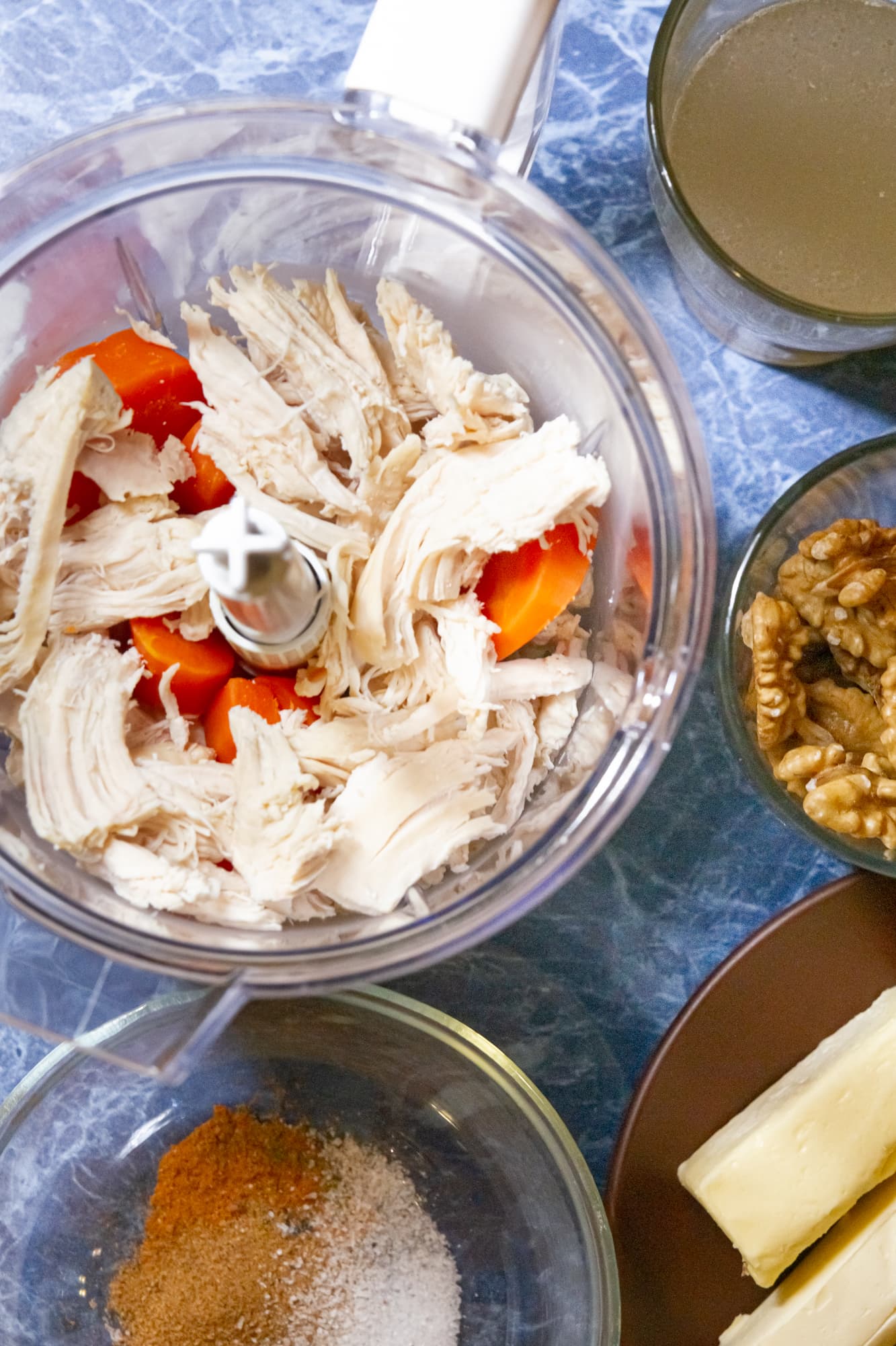 Сначала смешали на 1-й скорости курицу и морковь. На это ушло 20 секунд. Затем добавили в емкость обжаренный лук, немного сливочного масла, мускатный орех, перец, соль и грецкие орехи. Влили 150 мл бульона и запустили блендер уже на 2-й скорости на 50 секунд.