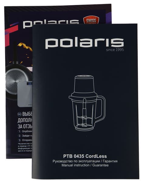 Беспроводной блендер Polaris PTB 0435 Cordless комплектуется инструкцией в виде 33-страничной брошюры на трех языках: русском, украинском и казахском. Русскоязычный текст занимает первые 10 страниц.