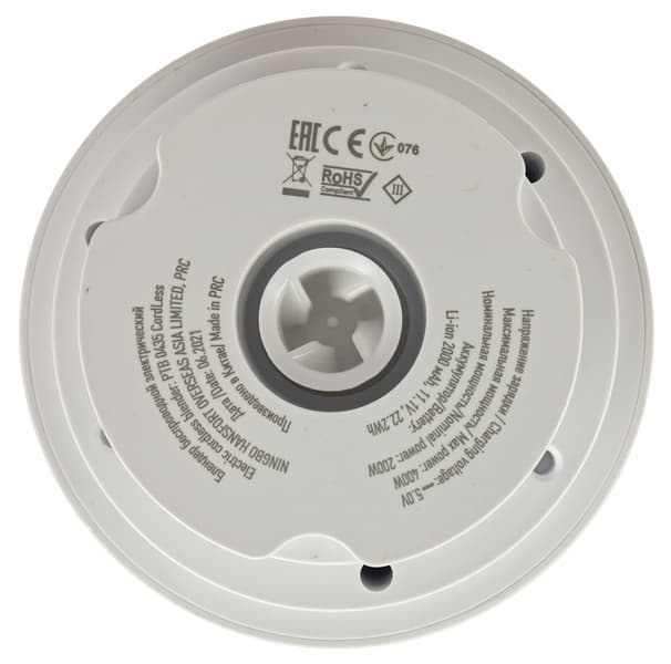 На обратной стороне — отверстия для подключения зарядного устройства, прикрытые резиновой вставкой. Все выглядит очень эстетично и аккуратно. Внизу мы видим значки, обозначающие принадлежность модели к серии Cordless, нанесенные на корпус серебристым цветом.