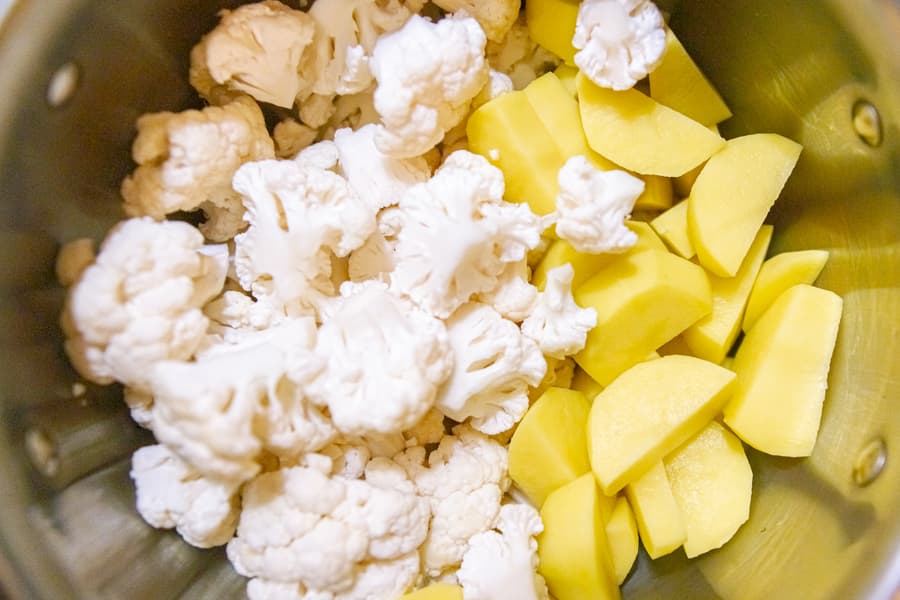 Капусту разобрали на соцветия, тщательно промыли и сложили в кастрюлю. Добавили в емкость очищенный нарезанный картофель и поставили вариться до мягкости овощей.