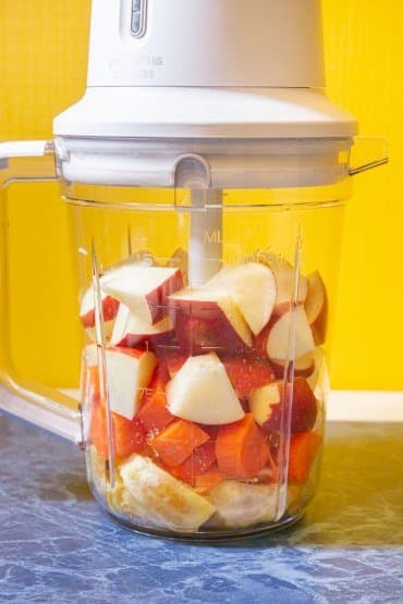 Вкусный и полезный напиток мы приготовили, поместив в чашу блендера разрезанные на небольшие кусочки морковь, яблоко и апельсин. Добавили к фруктам 100 мл воды и включили 2-ю скорость.