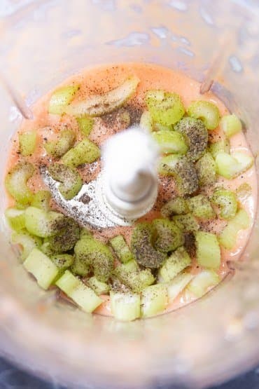Добавили пару нарезанных стеблей сельдерея, включили блендер еще на 20 секунд, и у нас получилось отлично взбитое и очень приятное на вкус томатное пюре.