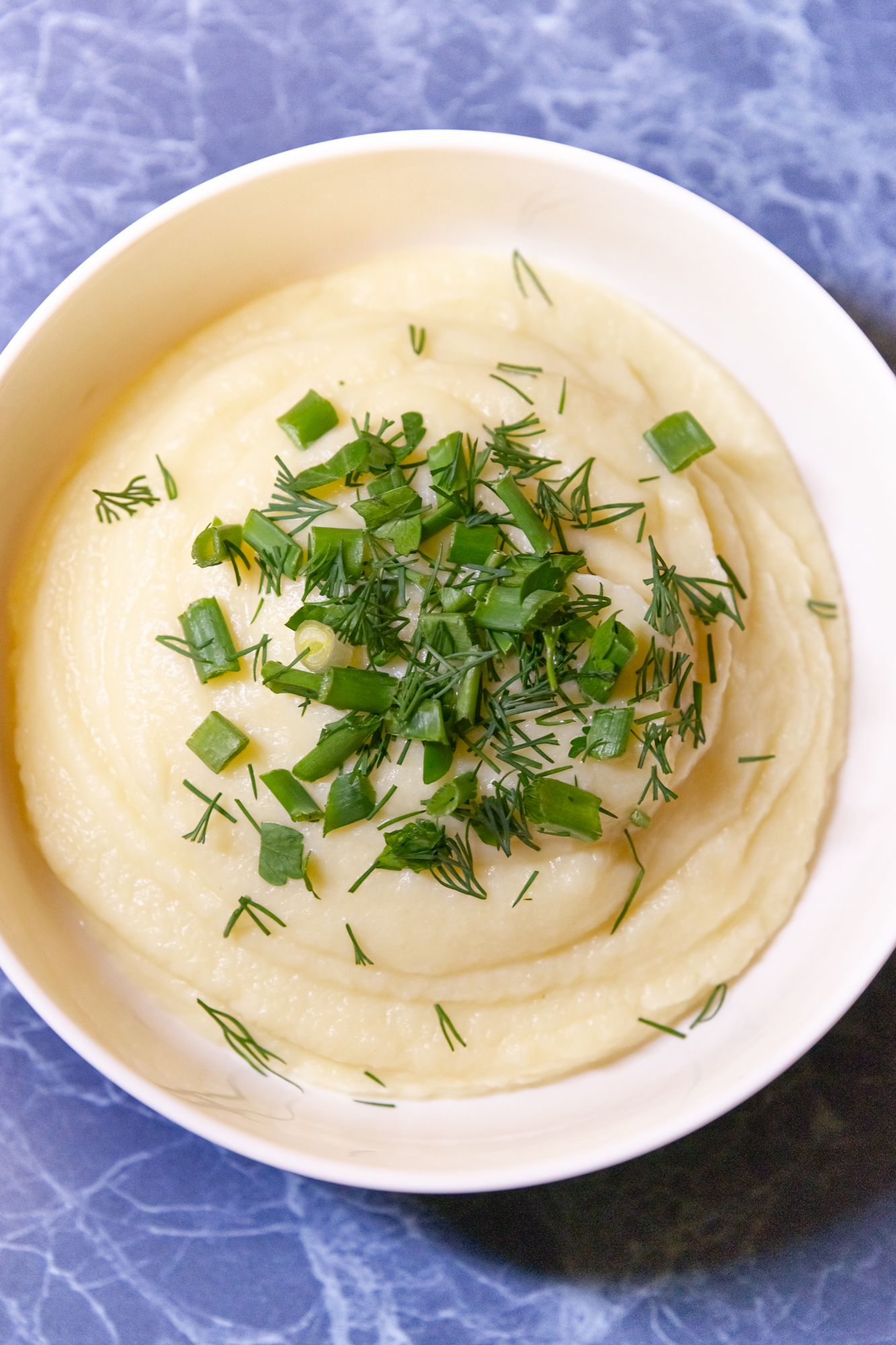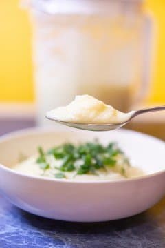 Затем слили бульон, оставив в кастрюле около 150 мл. Дождавшись остывания, переместили капусту с картофелем в кувшин. Влили немного подогретых сливок и взбивали будущий суп-пюре на 1-й скорости.