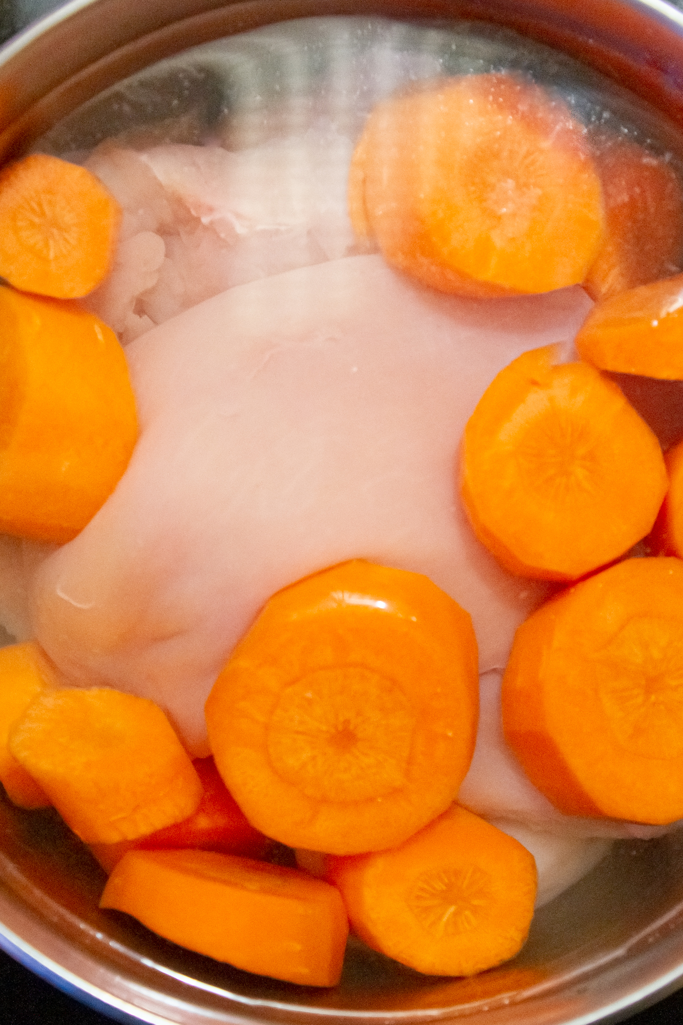 Куриное филе вместе с морковью сварили и отставили в сторону остывать. 150 мл получившегося бульона сохранили отдельно, он понадобится позже при перемешивании всех ингредиентов. Две небольшие луковицы мелко нарезали и обжарили на растительном масле.