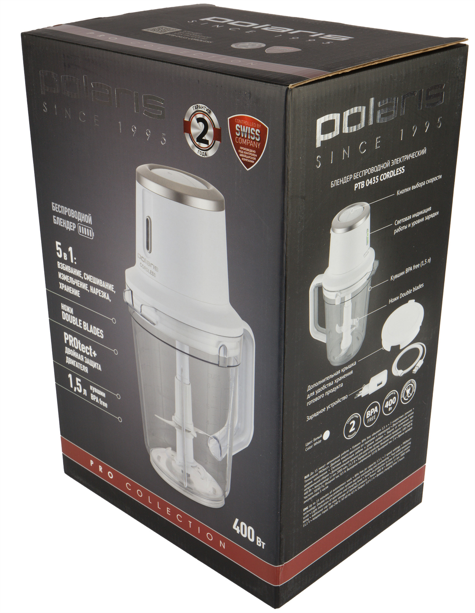 Беспроводной блендер Polaris PTB 0435 Cordless поступил к нам в прямоугольной коробке средних размеров. На лицевой и обратной сторонах фирменной упаковки напечатаны крупные фотографии прибора в собранном виде, краткое описание его возможностей и значок двухлетней гарантии. Боковые стороны содержат информацию об устройстве блендера и его технических характеристиках. На крышке коробки, кроме логотипа и названия прибора, размещен qr-код, ведущий на страницу с полным описанием модели.