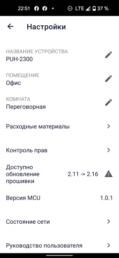 Через несколько минут устройство успешно обновлено. Воспользуемся случаем, чтобы познакомиться со страницей настроек: здесь мы можем переименовать прибор или помещение, к которому оно привязано; проверить ресурс расходных материалов (в нашем случае — смягчающего фильтра); добавить или удалить пользователя, у которого есть доступ к увлажнителю; проверить состояние сети (это может быть полезно при сбое подключения к прибору) и прочитать электронную версию руководства по эксплуатации.