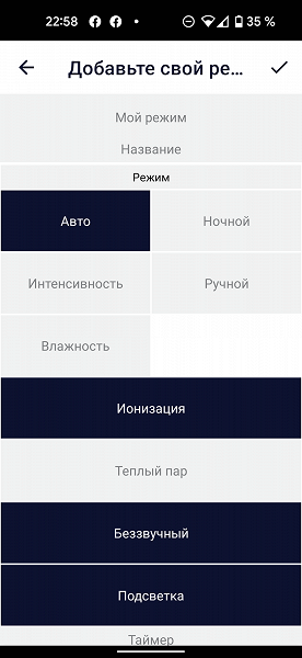 Чуть ниже можно выбрать подходящий режим работы (автоматический, ночной, детский, ручной) или настроить свой собственный, выбрав интенсивность увлажнения, целевую влажность, громкость звуковой сигнализации и дополнительные функции: ионизацию, теплый пар, беззвучность, подсветку дисплея и бака, а также время автоотключения прибора.