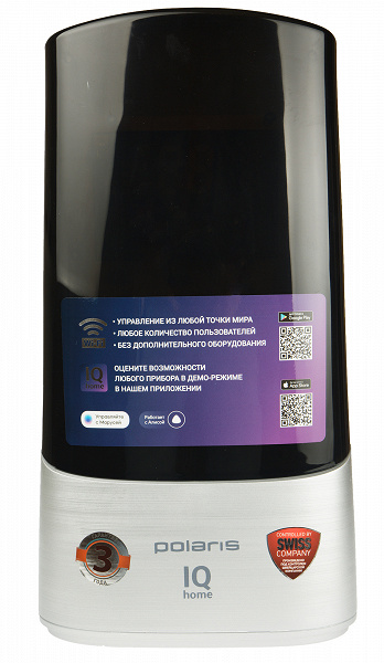 Также на упаковке мы видим логотипы Google Play и App Store (мобильное приложение Polaris разрабатывается для обеих платформ), иконки экосистемы IQ Home и голосовых помощников «Алисы» и «Маруси»: устройство поддерживает помощников Яндекса и Mail.Ru. Помимо этого, на лицевой стороне упомянуты (это обязательно для Polaris) производство под контролем швейцарской компании и трехгодичная гарантия на устройство. На боках размещены подробные технические характеристики прибора и QR-коды для загрузки приложения.