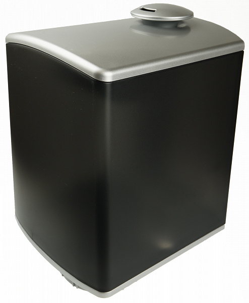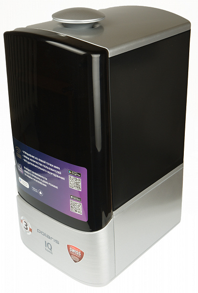 Передняя панель составляет единое целое с основанием и полностью закрывает спереди резервуар для воды. Под темным полупрозрачным пластиком есть, но в выключенном виде совершенно не виден светодиодный дисплей. А за рекламной наклейкой скрываются шесть сенсорных кнопок, управляющих устройством (подробно мы расскажем о каждой из них чуть ниже).