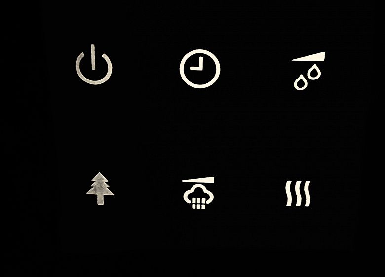 Для ручного управления увлажнителем предназначены шесть сенсоров на передней панели. В верхнем ряду располагаются кнопки: