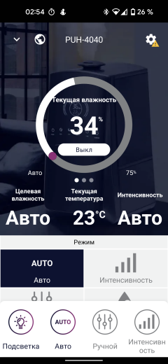 На главном экране мы видим текущую влажность и температуру в помещении и можем установить целевую влажность (для автоматического режима работы) или желаемую интенсивность увлажнения (минимальное, среднее или максимальное). Кнопка в центре круга включает устройство и переводит его в режим ожидания.