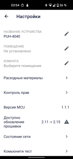 На этом этапе важно обратить внимание на восклицательный знак, всплывающий над кнопкой настроек в правом верхнем углу экрана: для нашего увлажнителя доступно обновление прошивки, которое настоятельно рекомендуется установить.