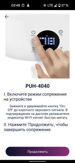 Автоматически обнаружив наш увлажнитель, программа выдает инструкцию по активации режима сопряжения (это делается длинным нажатием кнопки On/Off) и приступает к синхронизации.