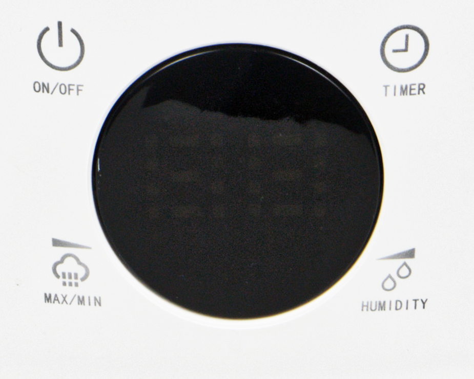 Кнопка Humidity позволяет задать целевой уровень влажности, при достижении которого увлажнитель приостановит работу. Он устанавливается в диапазоне от 25% до 75% с шагом в 5%. При работе в этом режиме на дисплее отображается значок «%RH»; узнать, что мы там задали, можно, коротко нажав на кнопку Humidity. Длинное нажатие на сенсор включает ночной режим: подсветка дисплея гаснет.