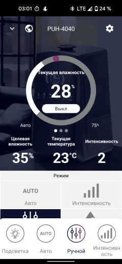 Чуть ниже можно выбрать подходящий режим работы (автоматический, ночной, детский, ручной) или настроить свой собственный, выбрав интенсивность увлажнения, целевую влажность.