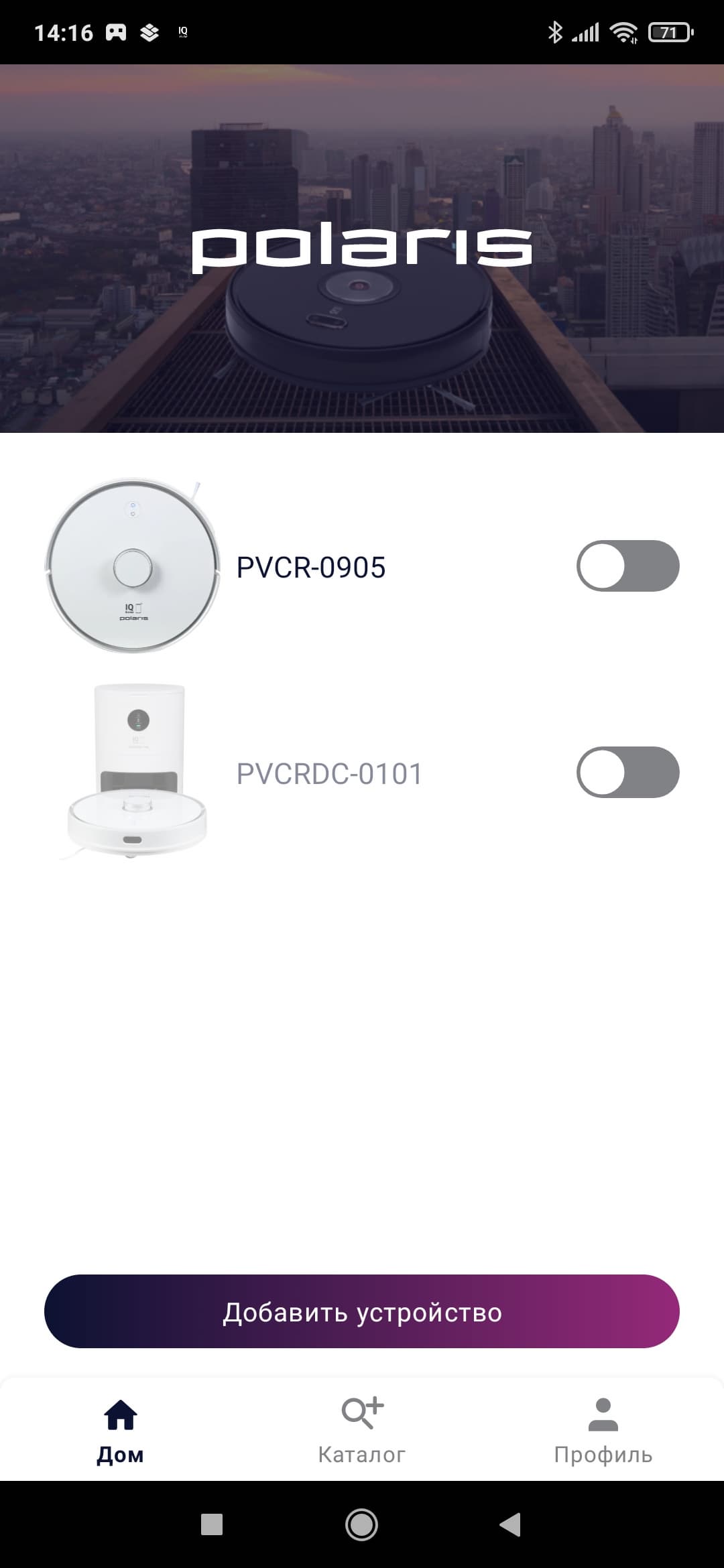 Процесс добавления увлажнителя стандартен — через главное окно «Умного дома» выбираем пункт «Добавить устройство», после чего выбираем из списка различных производителей Polaris IQ Home. Далее вводим данные от нашего аккаунта Polaris и получаем доступ к управлению увлажнителем.