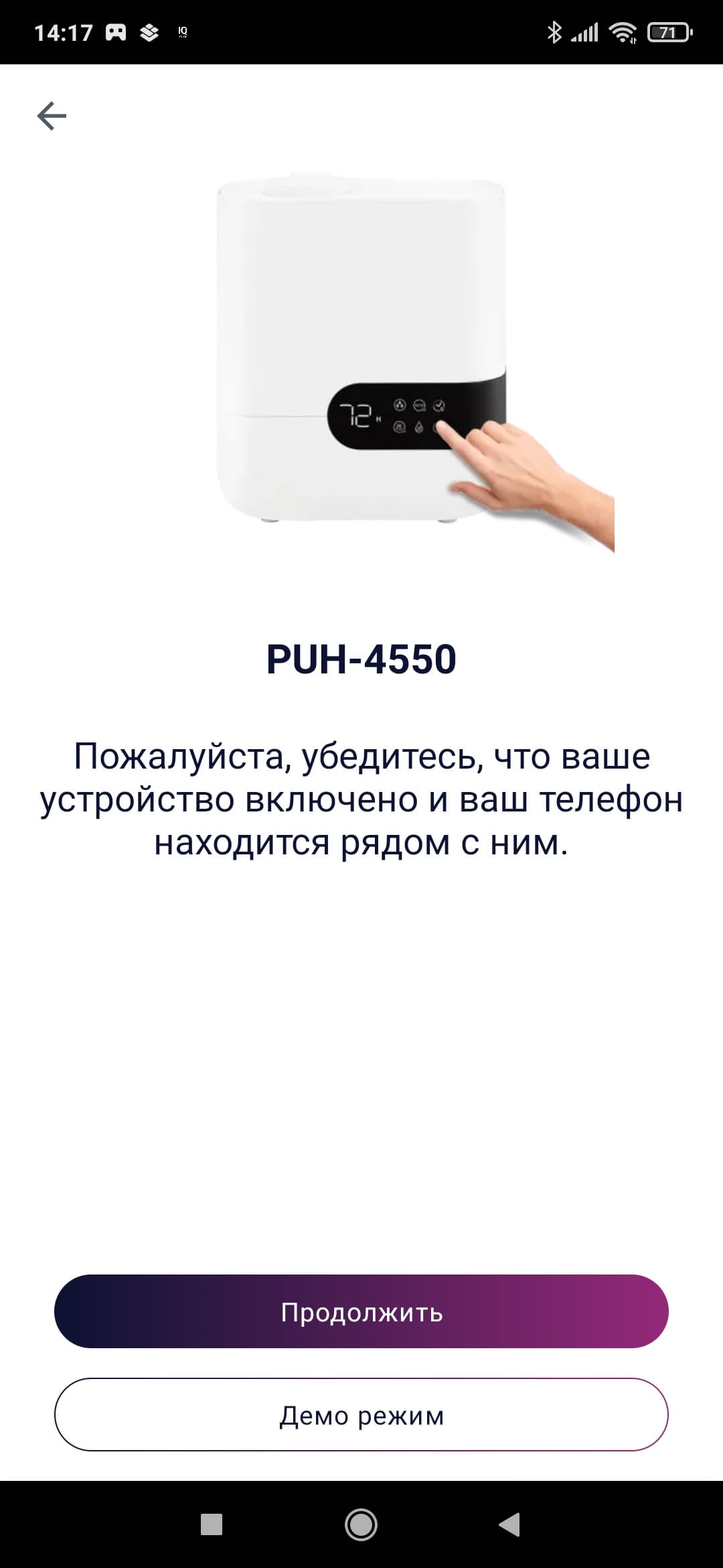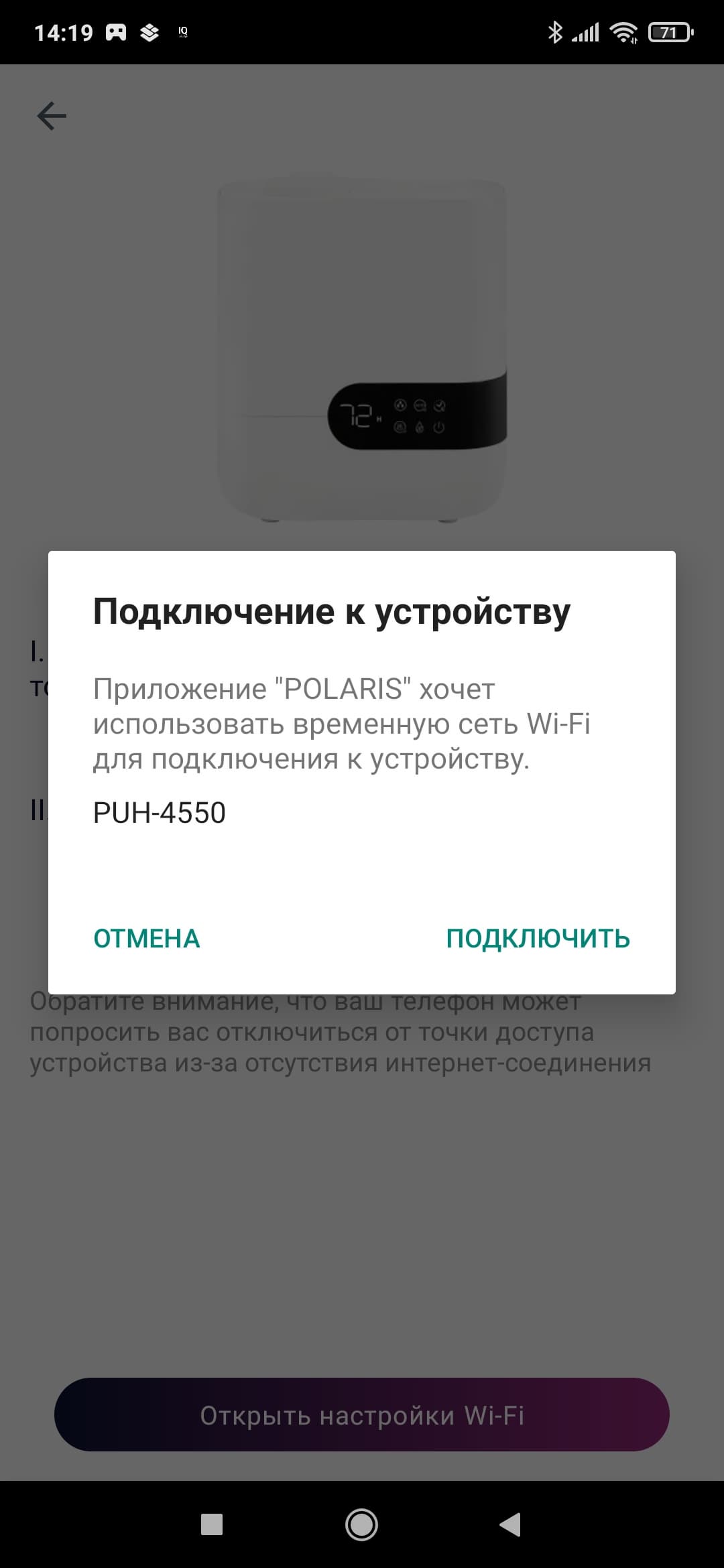 Инструкция приводит шаги по установке связи увлажнителя с приложением для Android и iOS. Следуя подсказкам, мы скачали приложение Polaris (IQ Home).