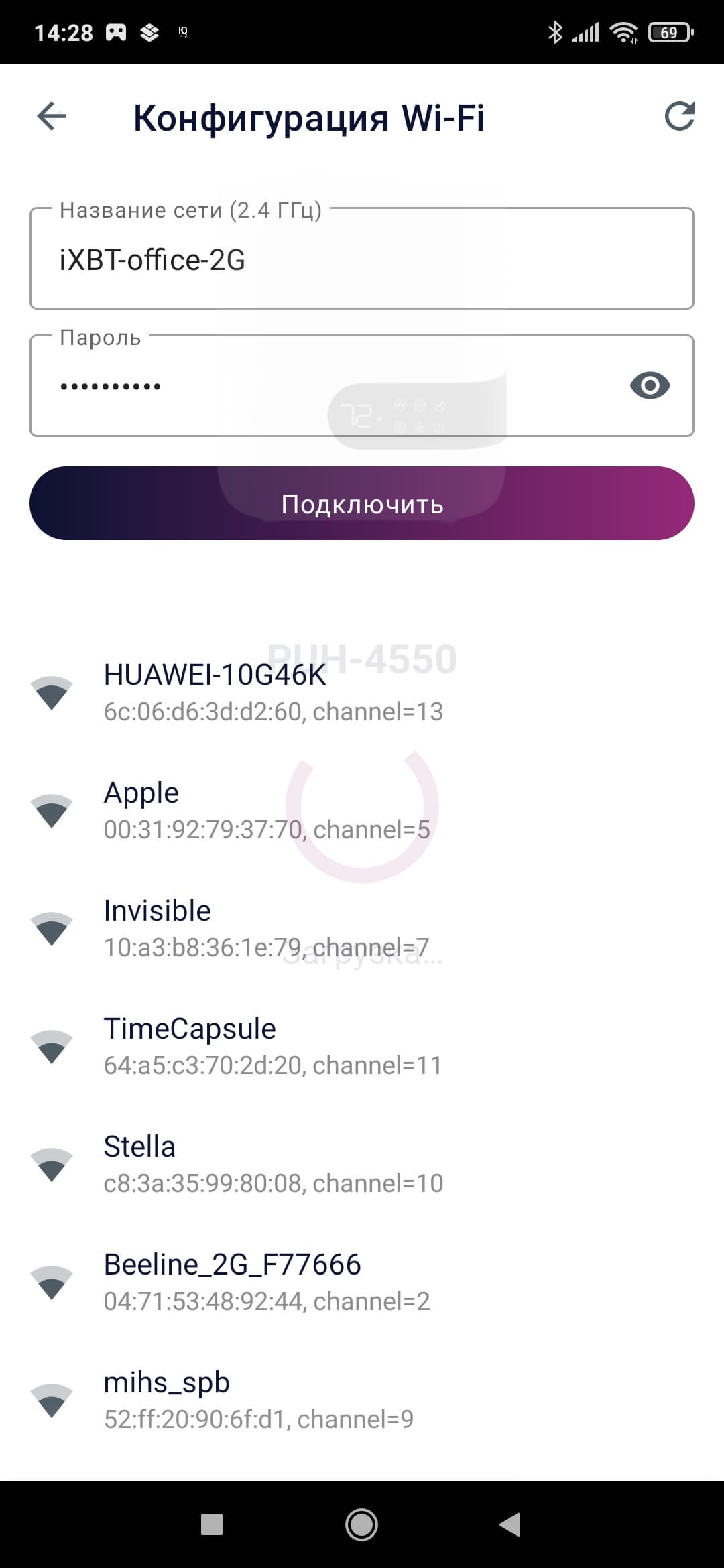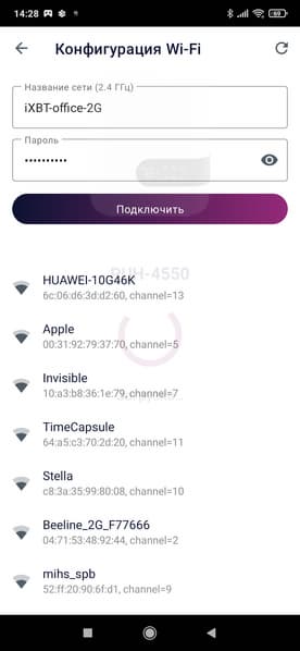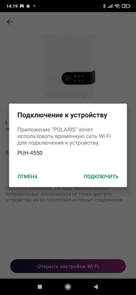 Классический метод подключения нам хорошо известен — устройство обнаруживается самостоятельно (либо его можно выбрать из списка), после чего пользователю нужно подключиться к Wi-Fi-сети увлажнителя и передать ему необходимые данные (пароль от роутера).