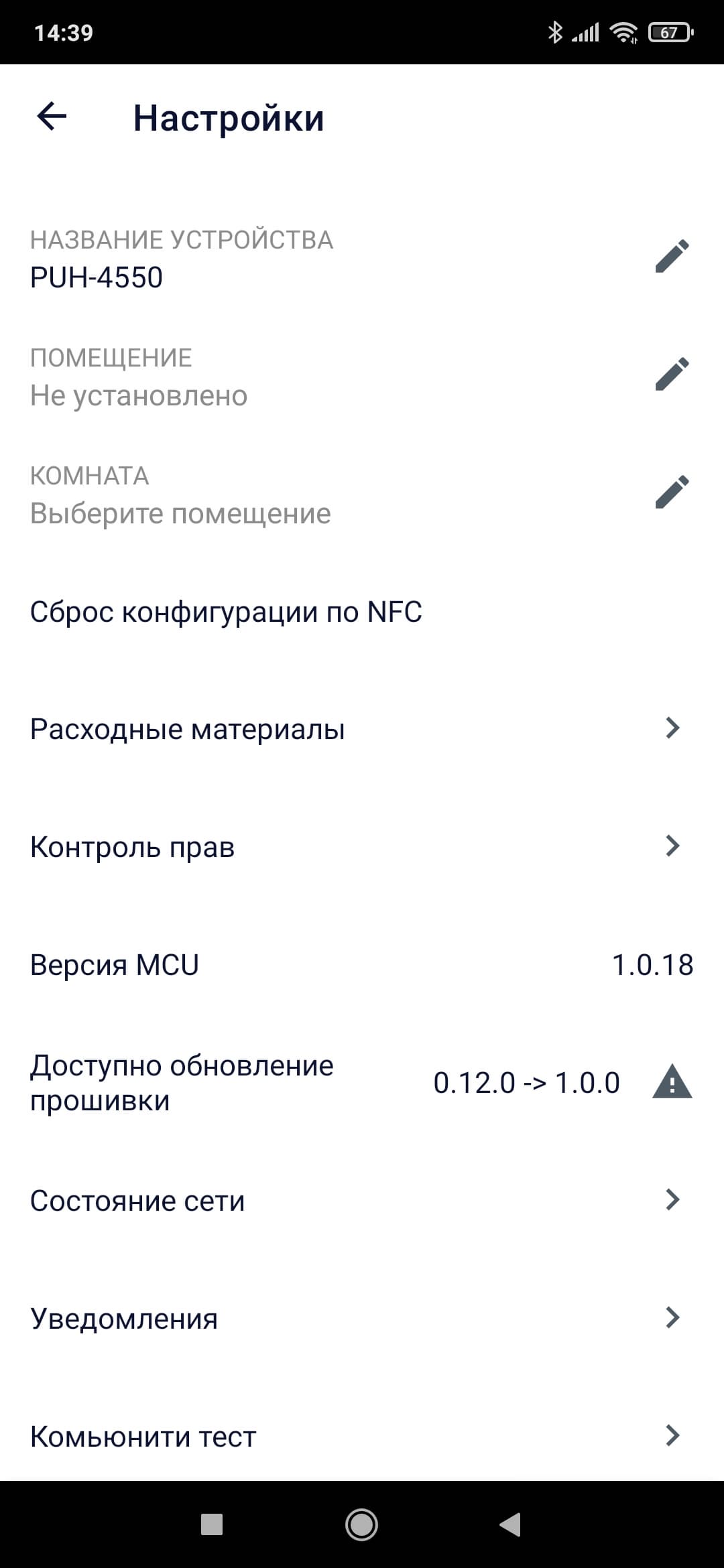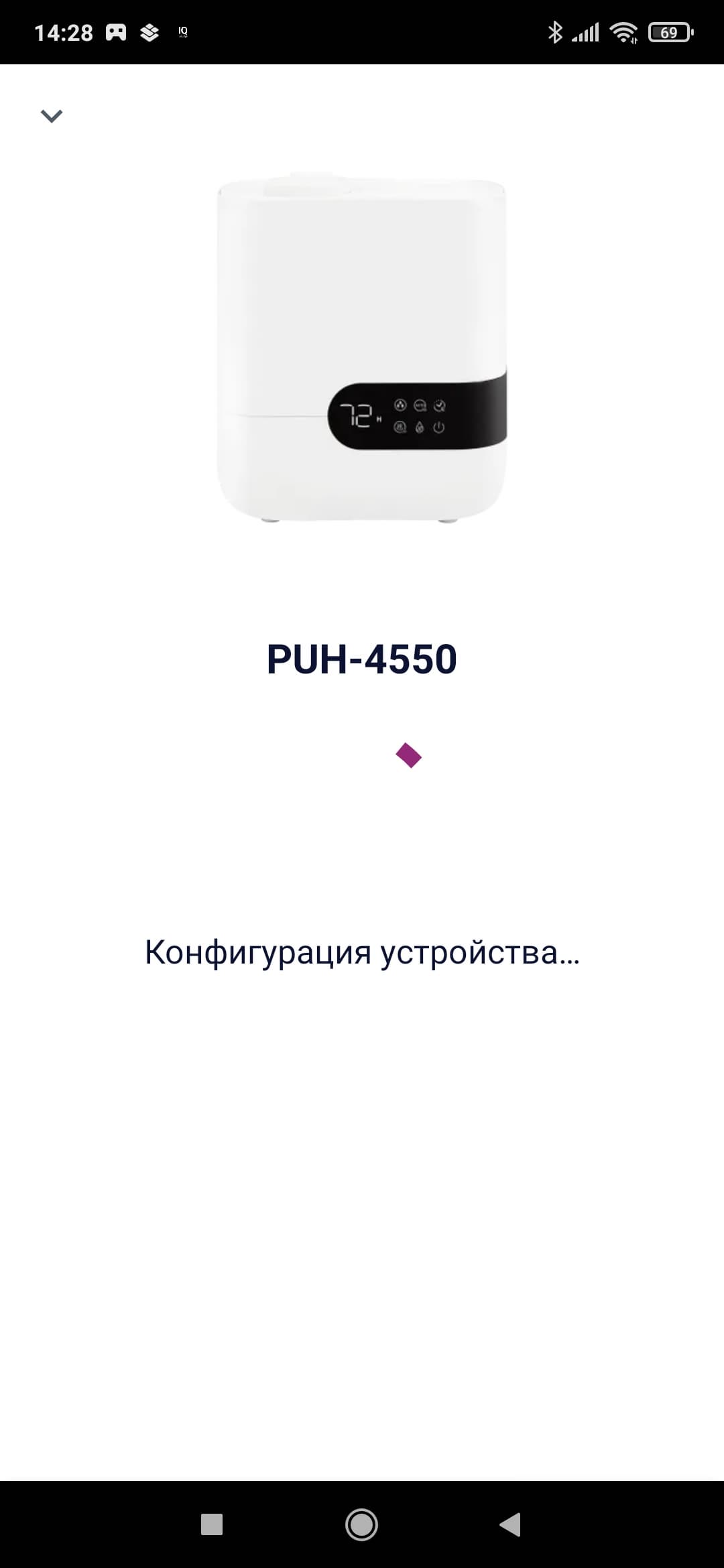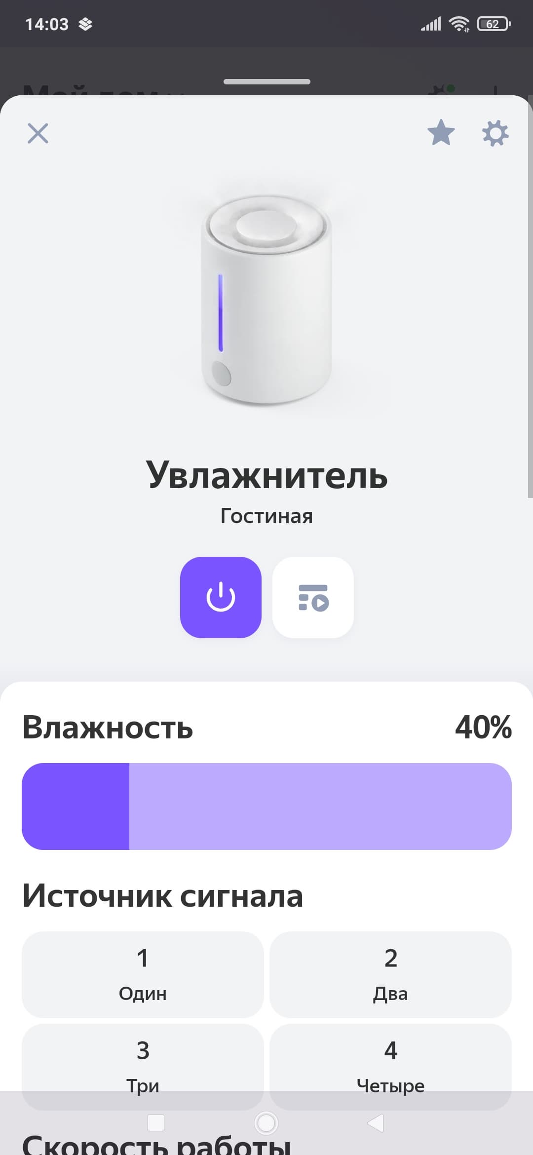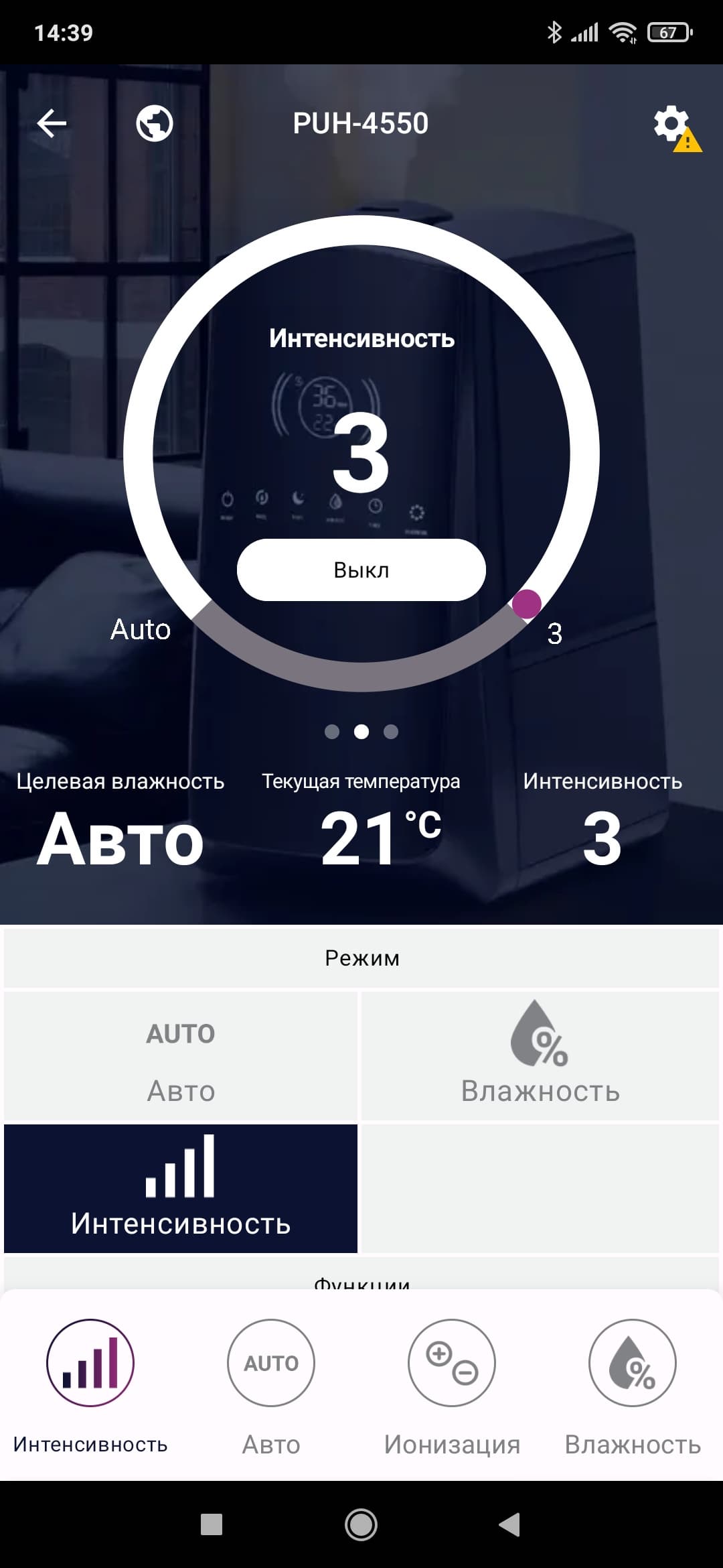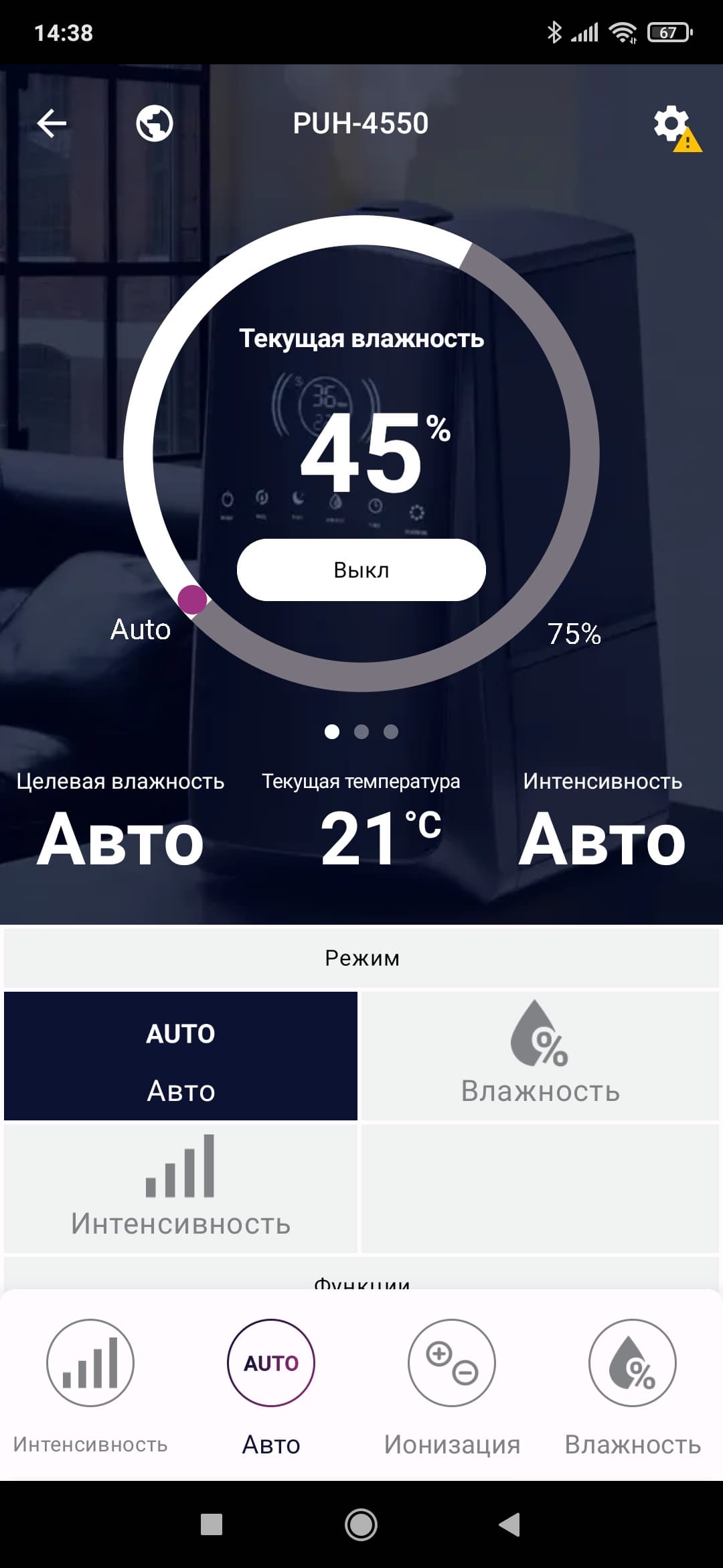Нажав на кнопку с изображением прибора, попадаем на главный экран. Он же — «пульт управления» увлажнителем.